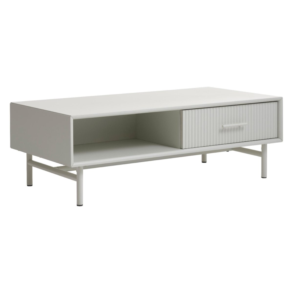 Deze stijlvolle salontafel in greige combineert een strak, modern design met slimme opbergruimte voor een opgeruimde woonkamer. De rechthoekige woonkamertafel is uitgevoerd met een open vak en een gesloten lade, ideaal om afstandsbedieningen, opladers, kabels en tijdschriften netjes uit het zicht te bewaren. Het MDF tafelblad in greige kleur, gecombineerd met het slanke metalen onderstel, zorgt voor een tijdloze uitstraling die perfect past in een minimalistische, Scandinavische of industriële inrichting. Dankzij de neutrale tint laat deze salontafel zich eenvoudig combineren met je bank, vloerkleed, houten meubels en woonaccessoires.