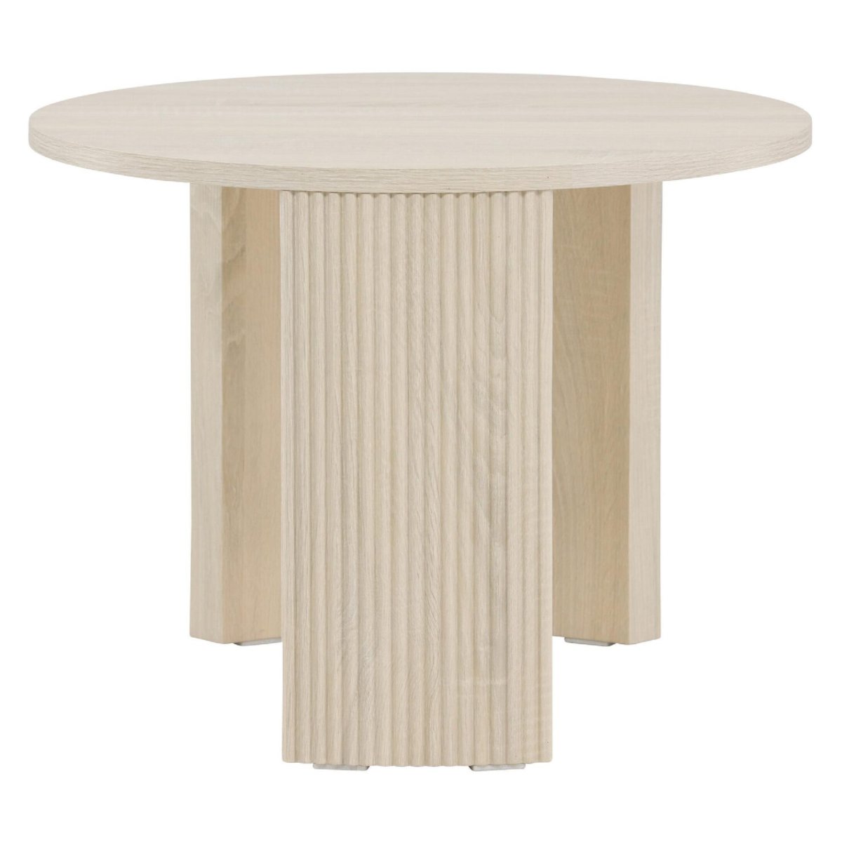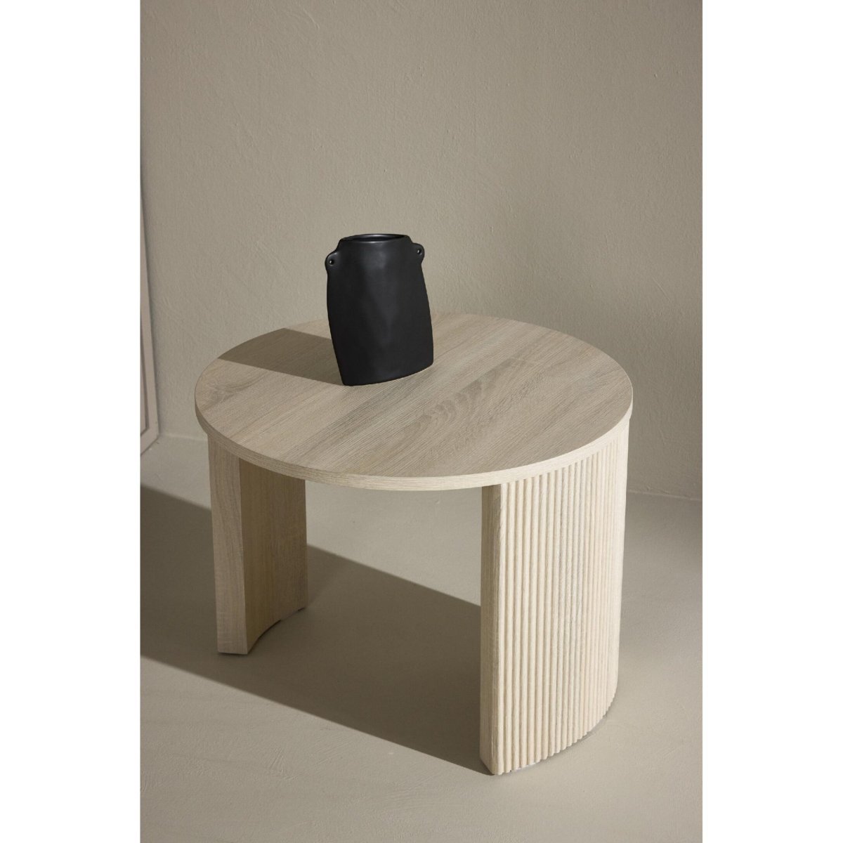 Een moderne, ronde salontafel in whitewash met een lichte, luchtige en veelzijdige uitstraling. Deze compacte koffietafel van MDF met een diameter van 60 cm en een hoogte van 45 cm is ideaal voor de woonkamer, kleinere appartementen, studio’s of als accenttafel naast een fauteuil. De gebroken witte kleur sluit naadloos aan bij een modern, Scandinavisch, minimalistisch of tijdloos klassiek interieur. Door de afgeronde vorm loop je er soepel omheen en creëer je een uitnodigende, comfortabele zithoek. Gebruik het tafelblad voor koffie, thee, tijdschriften, afstandsbedieningen of decoratieve items en geef je interieur direct een rustige, harmonieuze en opgeruimde uitstraling dankzij het onderhoudsvriendelijke oppervlak.