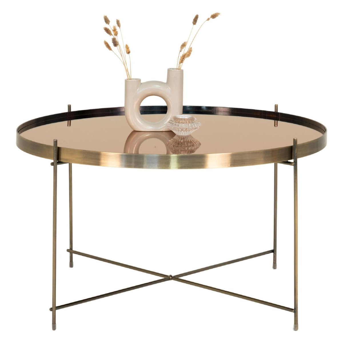 Een stijlvolle ronde salontafel met glazen blad en messingkleurig stalen onderstel geeft je woonkamer direct een luxe, moderne en lichte uitstraling. Het transparante glasblad van ø70 cm houdt je interieur ruimtelijk en luchtig, terwijl het stevige stalen frame met brass-finish voor een chic, warm accent zorgt. Met een hoogte van 40 cm sluit deze design salontafel perfect aan bij de meeste banken en loungehoeken. Dankzij het tijdloze ronde ontwerp combineer je de tafel moeiteloos met een modern, industrieel, klassiek of hotel-chic interieur. Ideaal als koffietafel, centrale salontafel op je vloerkleed of als elegante bijzettafel in je zithoek.