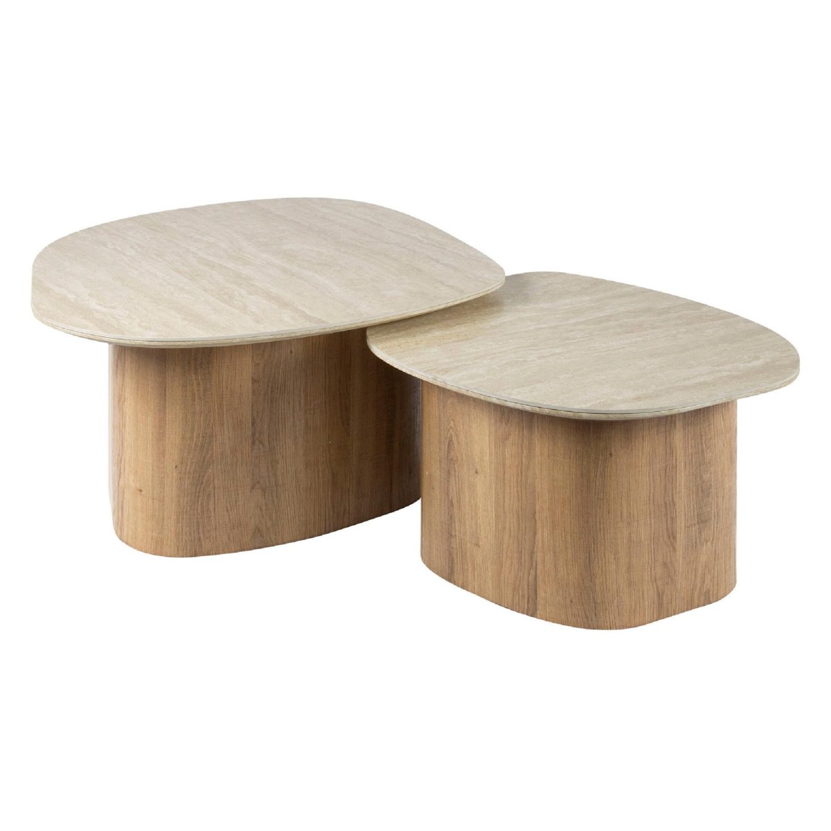 De Sorell salontafel set valt op door de mix van organische vormen en natuurlijke materialen. De ronde, kiezelvormige bladen met zachte lijnen geven de tafels een vriendelijke en rustig ogende uitstraling. De afgeronde kolompoten met eikenhoutlook brengen warmte en textuur in je interieur en vormen een stijlvol contrast met het lichte keramiek travertin blad.