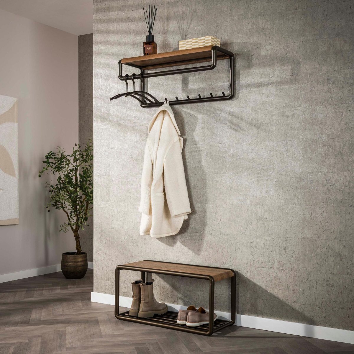 Schoenenbank Femke sluit perfect aan bij een doordachte halinrichting waarin opbergen, doorloopruimte en stijl in balans zijn. Combineer de bank eenvoudig met een wandkapstok, spiegel, kledingrek of opbergkast, zodat jas, tas, sjaals en schoenen allemaal een vaste plek krijgen. De neutrale drift brown kleur en het bronzen frame passen zowel bij lichte als donkere wanden en bij verschillende vloertypen, zoals hout, PVC, laminaat of tegels. Plaats de halbank bijvoorbeeld direct onder een kapstok bij de voordeur, naast een garderobekast of onder een smalle wandplank voor sleutels, post en accessoires. Zo creëer je een overzichtelijke, gezellige entree waar je dagelijks plezier van hebt en waar gasten meteen een opgeruimde eerste indruk krijgen.