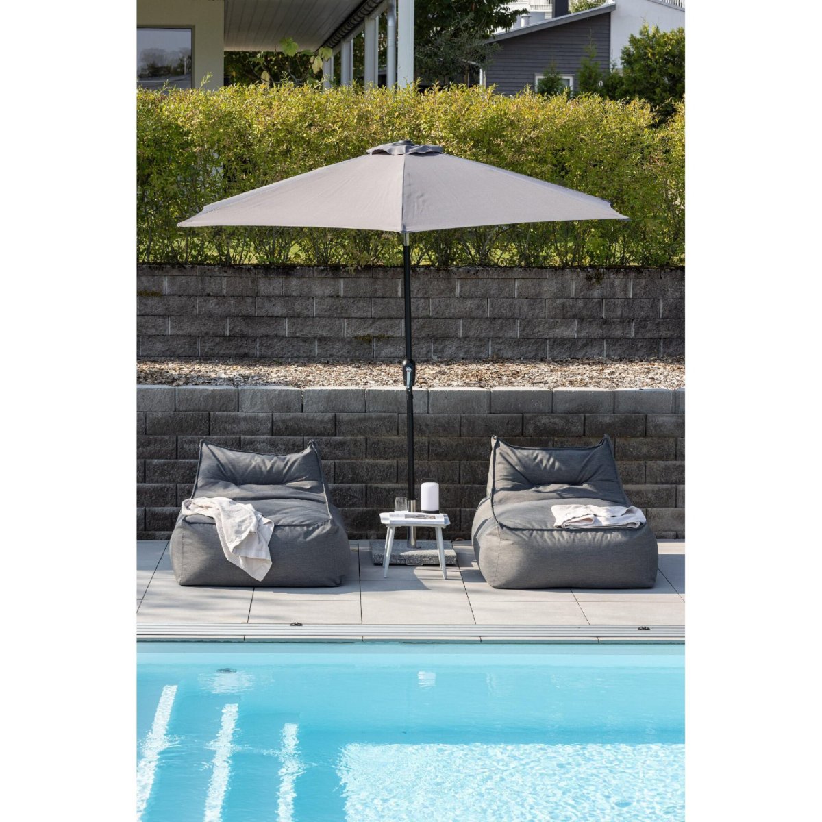 De grijze hoofdkleur sluit naadloos aan bij moderne, minimalistische en industriële buitenruimtes. De parasol mixt moeiteloos met: