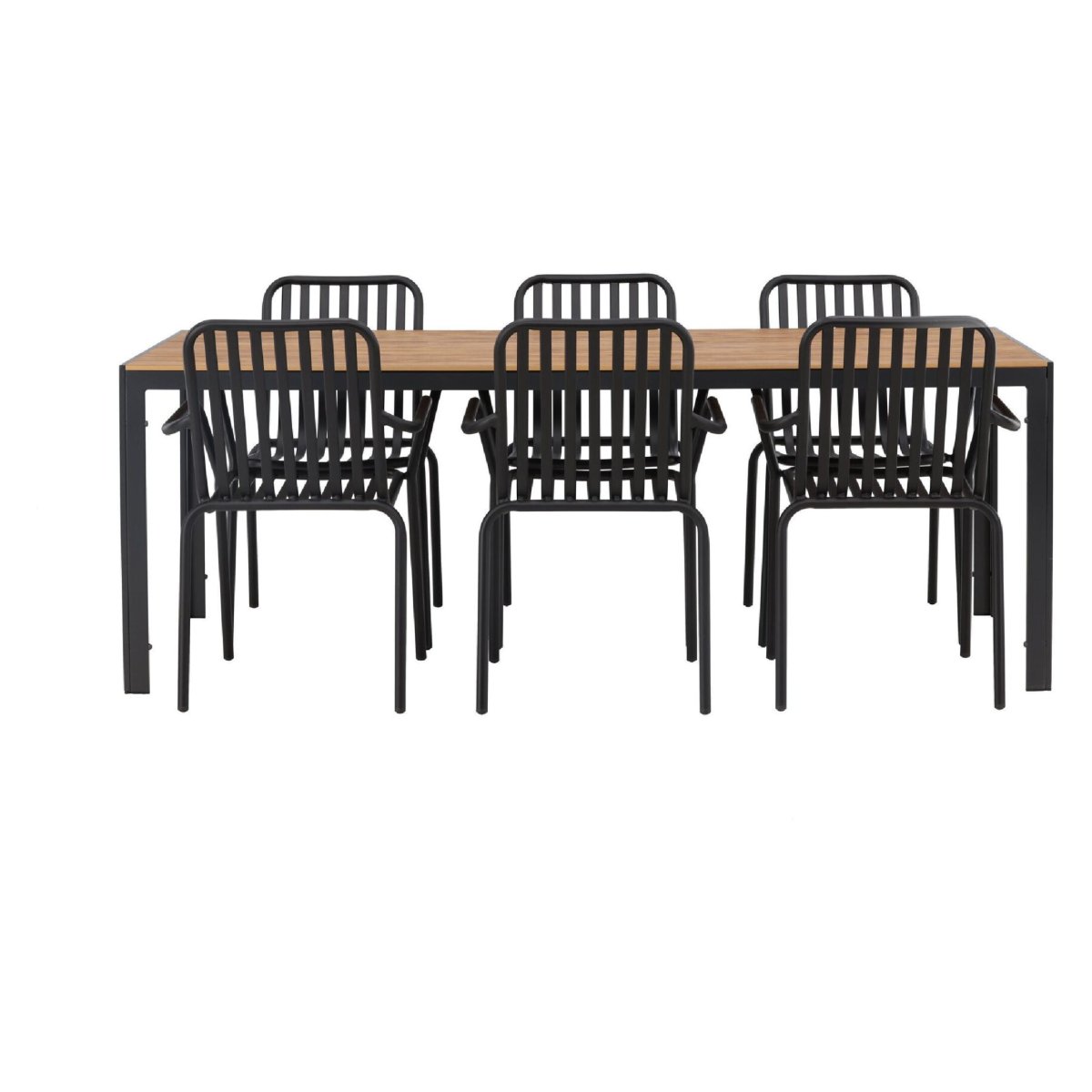 Breng direct sfeer, stijl én comfort naar je terras met deze complete 6-persoons tuinset. De ruime rechthoekige tuintafel van 200×90 cm heeft een strak zwart aluminium frame en een onderhoudsvriendelijk aintwood tafelblad met realistische houtlook. De bijpassende tuinstoelen zijn licht van gewicht, voorzien van geïntegreerde armleuningen en uitgevoerd in tijdloos zwart voor een moderne en elegante uitstraling. Deze weerbestendige buiten eethoek is ideaal voor lange avonden tafelen in de tuin, op de veranda of op een ruim balkon. Dankzij het neutrale kleurenpalet combineer je de set eenvoudig met tuinkussens en buitenaccessoires in elke stijl.