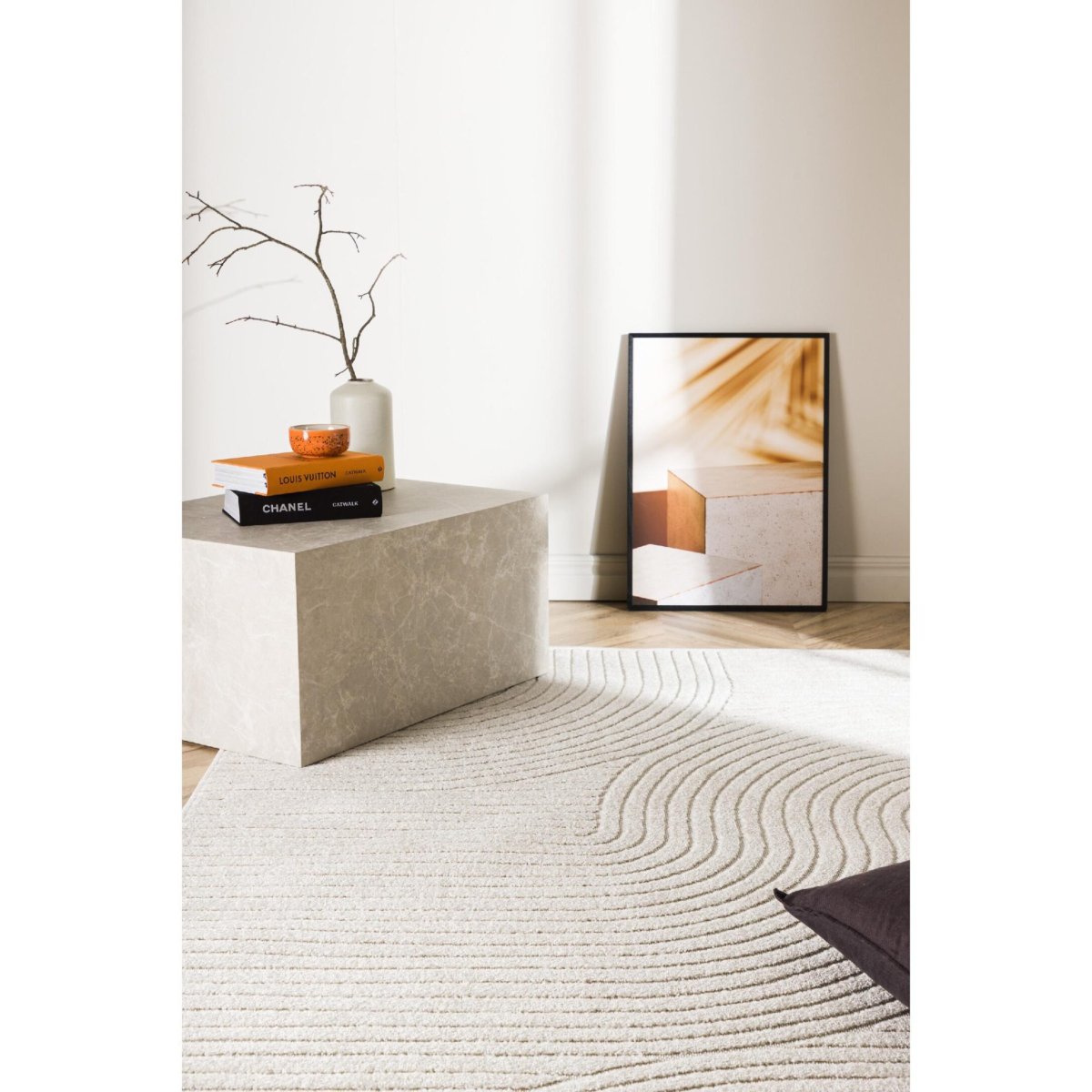 Het grafische lijnpatroon zorgt voor ritme en structuur, zonder de ruimte druk te maken. Zo creëer je direct meer rust, balans en eenheid in je interieur. De botwitte tint reflecteert licht, waardoor je woonkamer of slaapkamer groter en lichter oogt, terwijl de strakke lijnen subtiel beweging en diepte toevoegen. Dit grote vloerkleed vormt een verbindende basis onder een bank, salontafel of bed, zodat losse meubels één geheel worden.