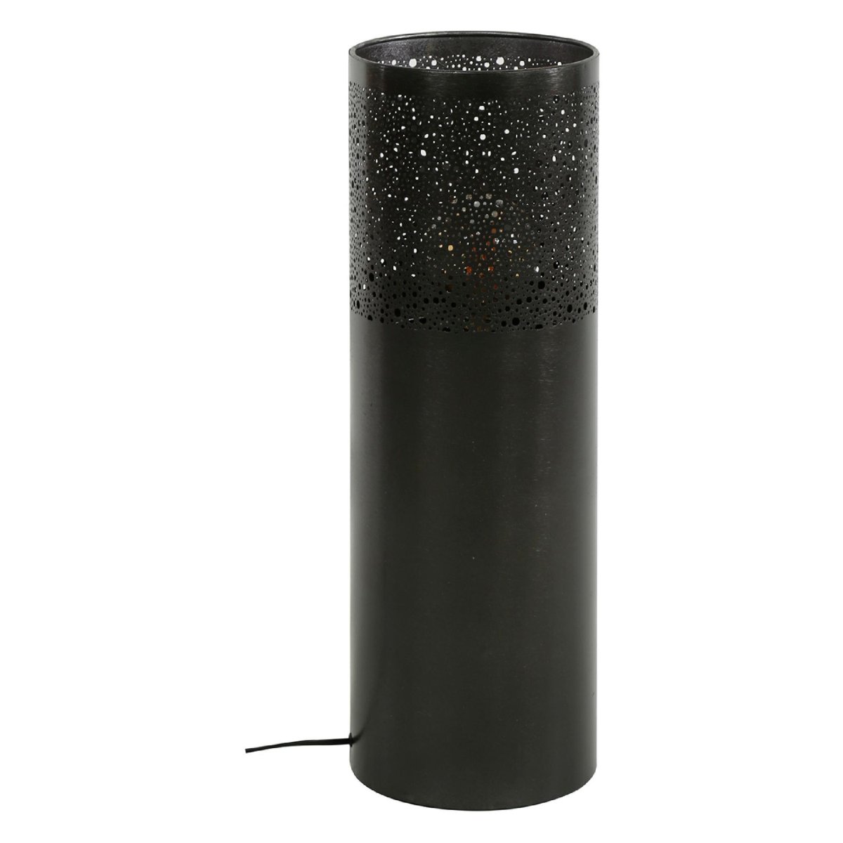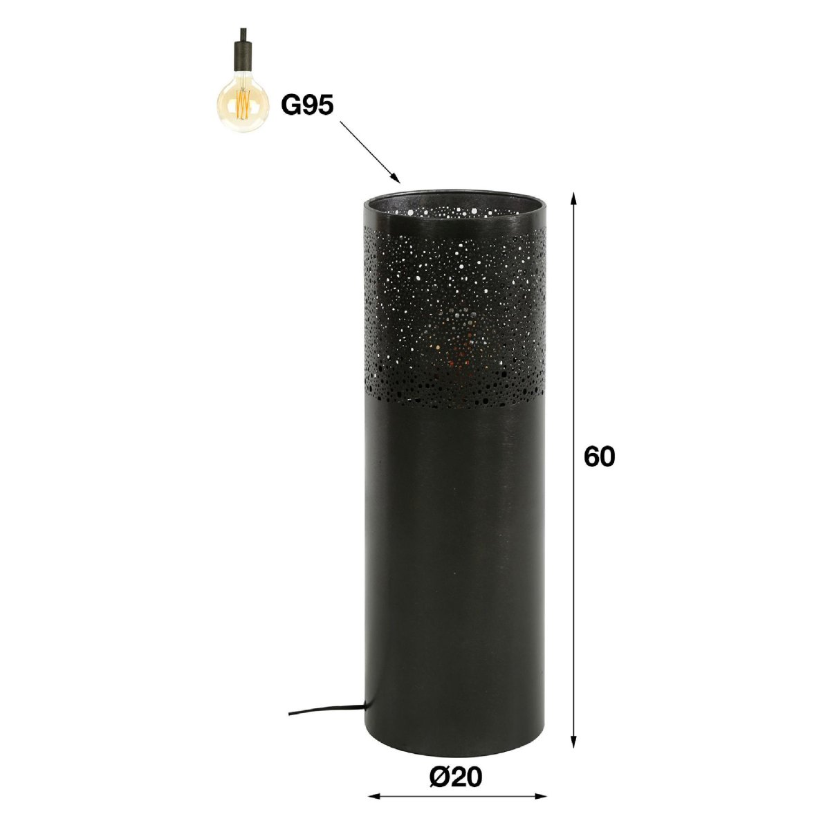 Deze cilindervormige vloerlamp in zwart nikkel is een stijlvolle sfeermaker én echte blikvanger voor je interieur. Met een hoogte van 60 centimeter en een slanke diameter van 20 centimeter schuif je deze staande lamp gemakkelijk naast de bank, in een hoek van de woonkamer of naast het bed in de slaapkamer. De metalen kap heeft aan de bovenzijde meerdere ronde uitsparingen, waardoor het licht speels door de gaatjes schijnt en een uniek lichteffect op muur en plafond creëert. Dankzij het enkele E27 lichtpunt kies je zelf een passende LED lichtbron, ideaal als sfeerlamp of als subtiele extra verlichting in huis.