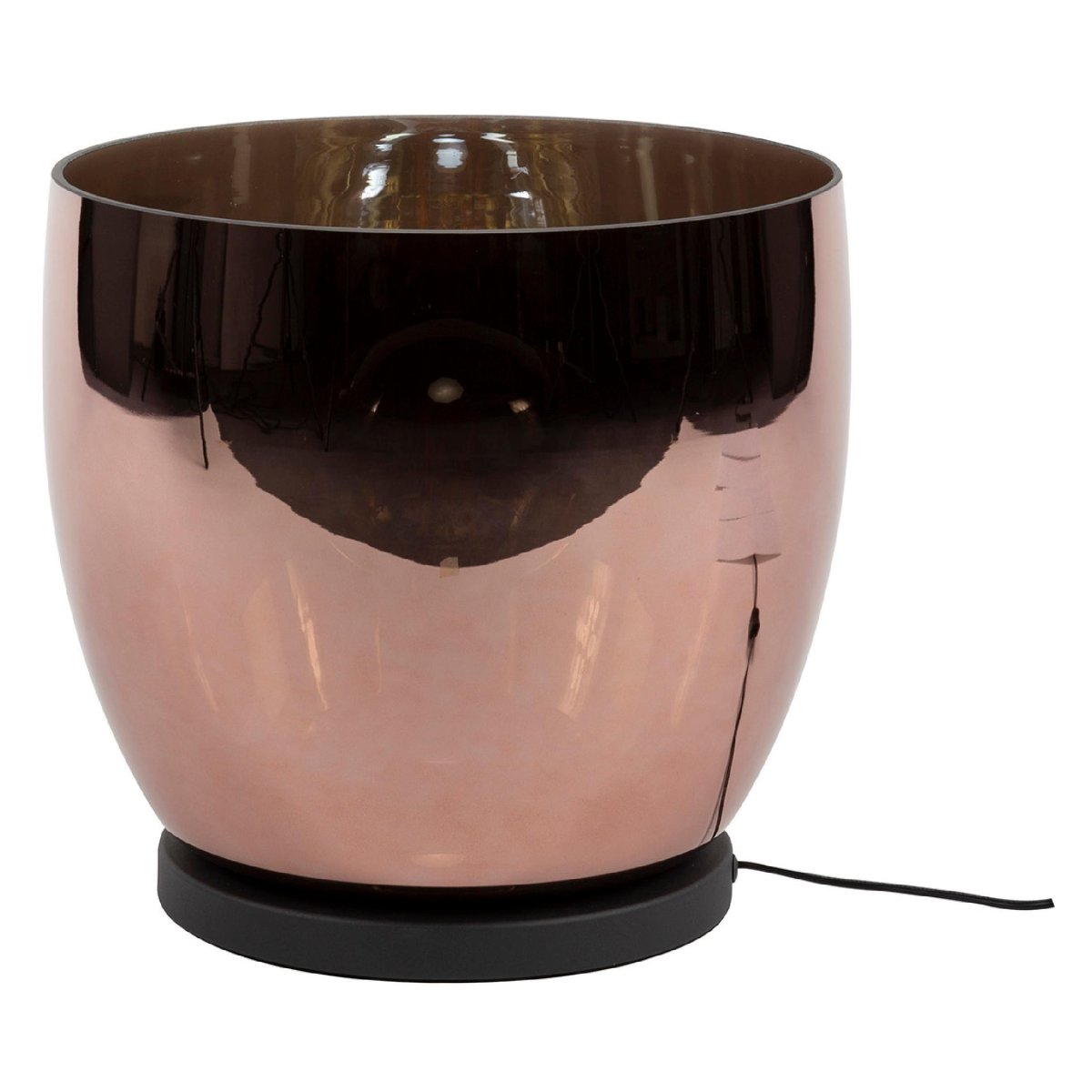De koperkleurige glazen kap van deze vloerlamp creëert direct een warme en uitnodigende sfeer in de ruimte. Het licht wordt subtiel gefilterd door het getinte glas, waardoor een zachte, warme gloed ontstaat die perfect is voor sfeerverlichting in de avond. Zet de lamp naast de bank, bij een comfortabele leesstoel of in een donkere hoek van de kamer en je ervaart meteen hoeveel extra gezelligheid en diepte de verlichting toevoegt. Dankzij de ronde glazen vorm wordt het licht rondom mooi en egaal verdeeld, zonder harde lichtovergangen. Combineer de vloerlamp met een (dimbare) LED filament lichtbron voor een extra stijlvol effect: zo stem je de lichtsterkte eenvoudig af op het moment van de dag, van helder en functioneel tot gedimd en intiem. Met deze staande lamp haal je een veelzijdige designlamp in huis die zowel decoratief als functioneel is.