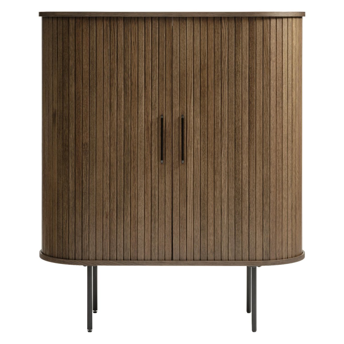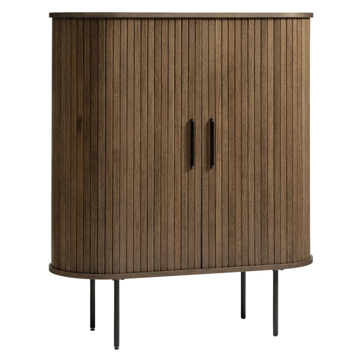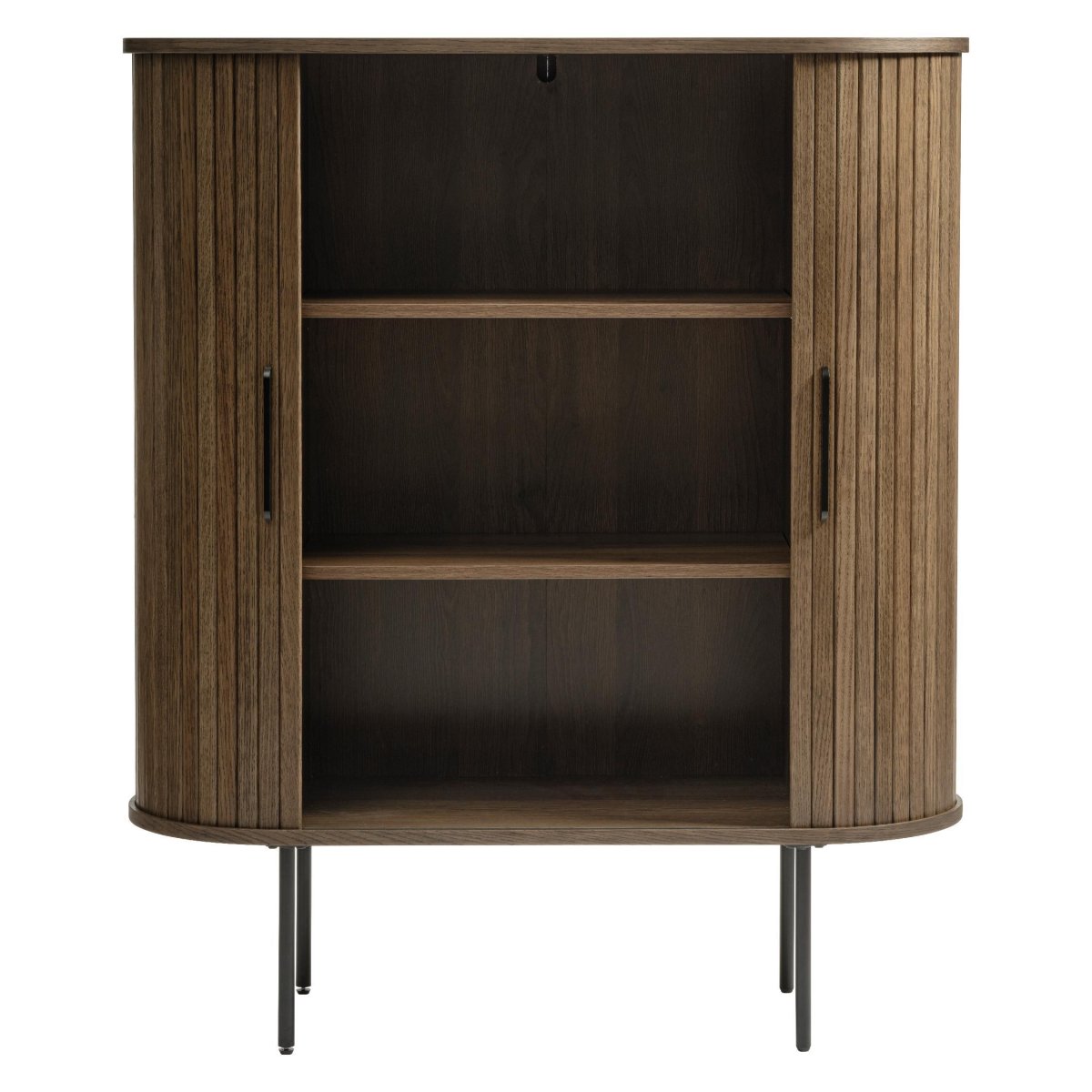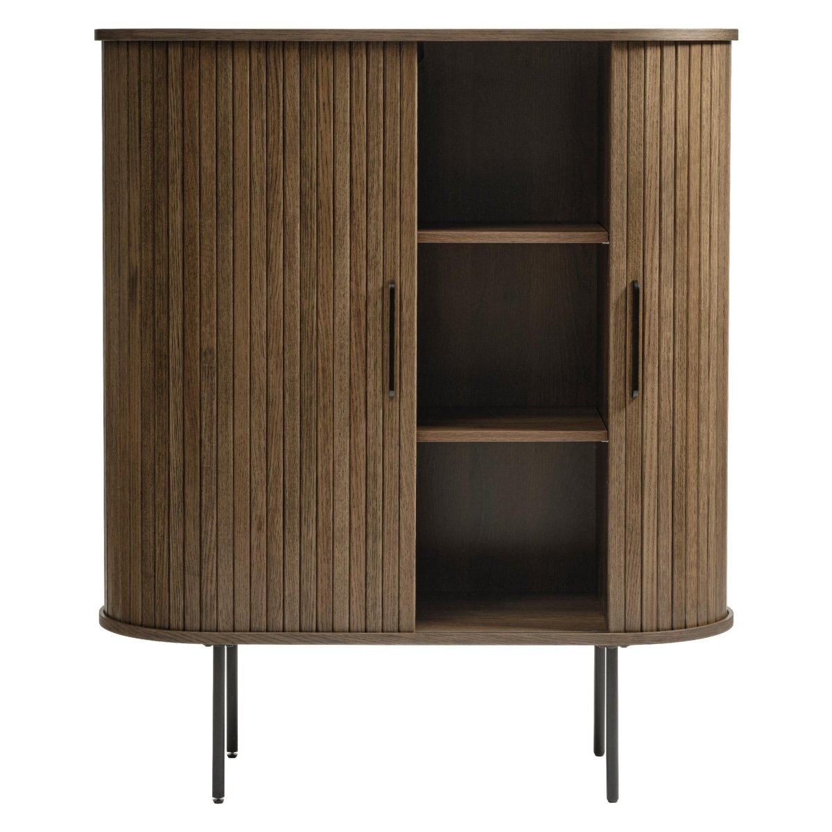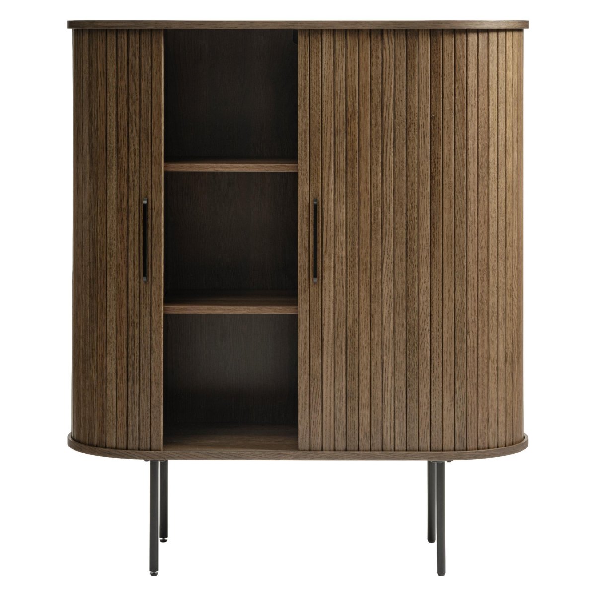 Deze moderne wandkast met schuifdeuren combineert warm bruin eikenfineer met een strak, eigentijds design. De kast biedt royale opbergruimte voor boeken, servies, glazen, mappen of woonaccessoires en past dankzij het compacte formaat perfect in de woonkamer, eetkamer, werkkamer of hal. De verticale groeven in de fronten zorgen voor een luxe, designvolle uitstraling, terwijl het zwarte metalen onderstel de kast een luchtige, industriële look geeft. Dankzij de twee ruimtebesparende schuifdeuren heb je geen draaihoek nodig en blijft je leefruimte overzichtelijk en opgeruimd. Ideaal als opbergkast, dressoir of pronkstuk tegen de wand, met praktische, in hoogte verstelbare legplanken en een duurzame, gerookte lakafwerking die gemaakt is voor dagelijks gebruik.