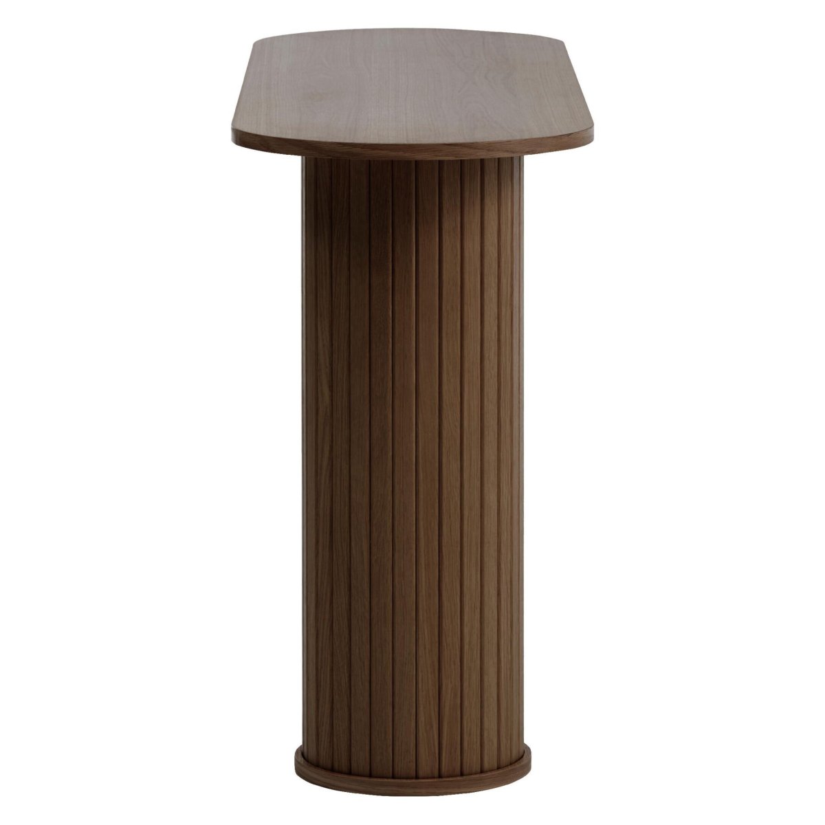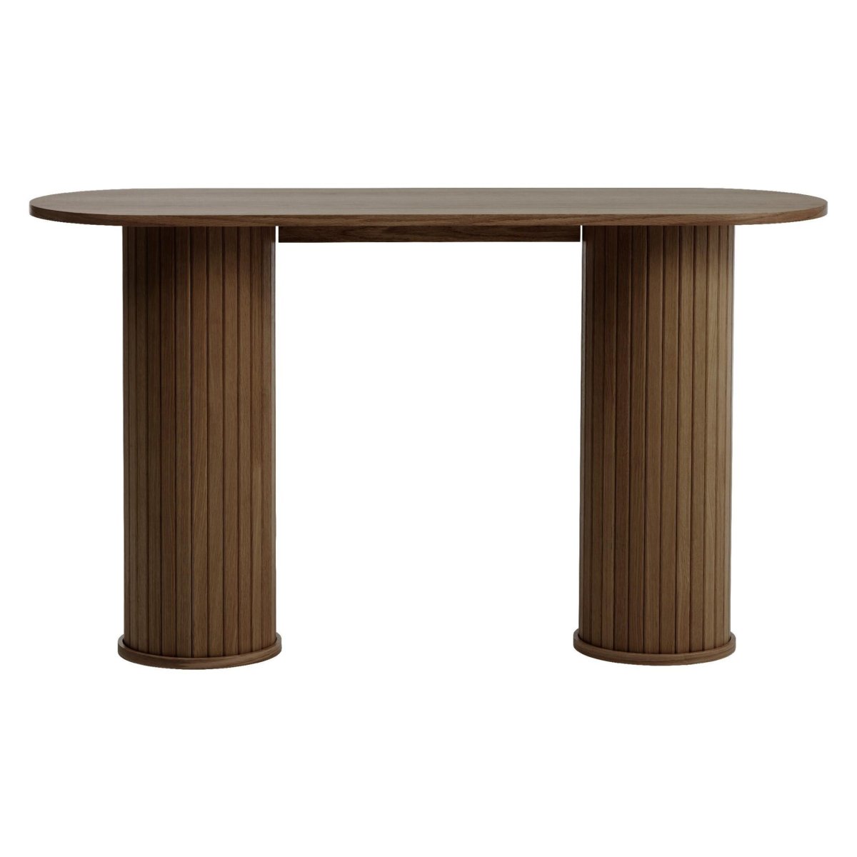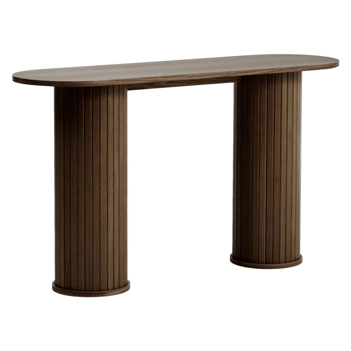 Een luxe wandtafel die direct sfeer en klasse toevoegt aan je hal, gang of woonkamer. Deze moderne sidetable valt op door het ovale blad in gerookt eikenfineer en twee ronde kolompoten met verfijnde verticale groeven. De diepe bruine kleur met smoked glaze-afwerking sluit naadloos aan bij uiteenlopende woonstijlen, van eigentijds en Scandinavisch tot hotel chique. Door de strakke vormgeving, het slanke silhouet en de hoogwaardige fineerlaag is dit de perfecte haltafel of console om accessoires, een spiegel, kunstobject of tafellamp stijlvol te presenteren.