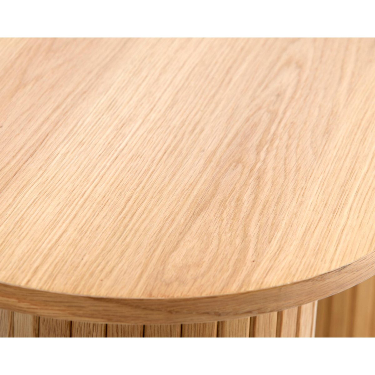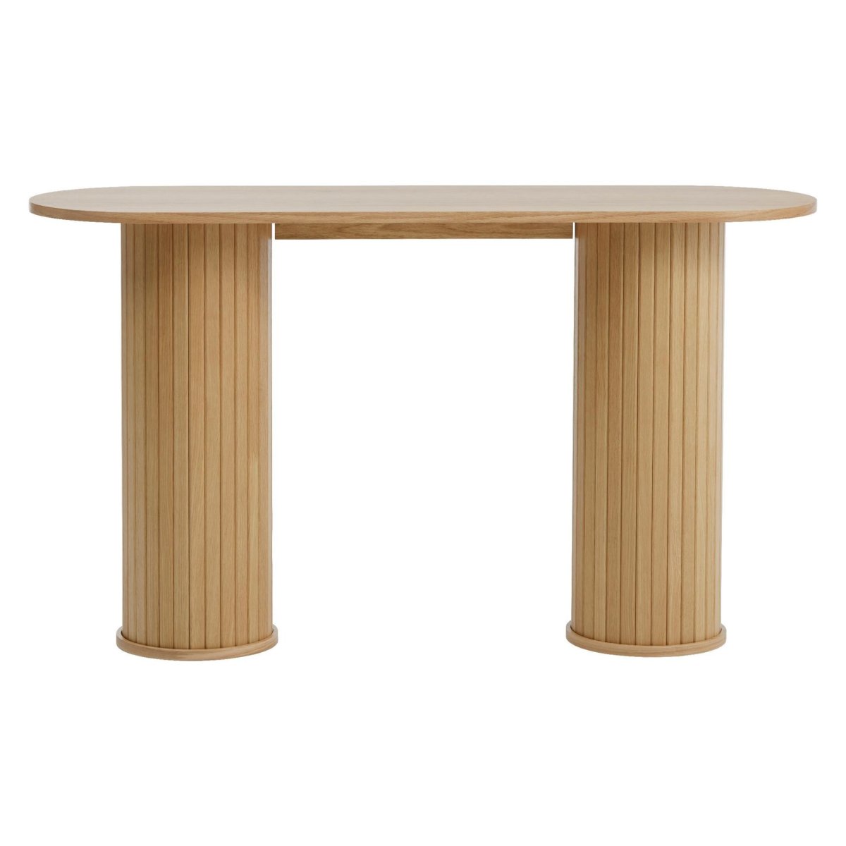 Een moderne, ovale wandtafel die stijl en functionaliteit moeiteloos combineert. Deze elegante sidetable past perfect in je hal, woonkamer of slaapkamer en vormt een subtiel statement in elk modern, Scandinavisch of minimalistisch interieur. De naturel eikenlook geeft warmte, terwijl de twee ronde poten met verticale groeven zorgen voor een strak, architectonisch silhouet. Dankzij het slanke blad van 40 cm diep blijft je loopruimte ruim, maar heb je toch voldoende plek voor een vaas, sleutelbakje, boeken of decoratie. Het eikenfineer op MDF oogt natuurlijk en hoogwaardig, terwijl de beschermende glanslaag het meubel geschikt maakt voor dagelijks gebruik. Ideaal als haltafel, console, stylingtafel of kaptafel.