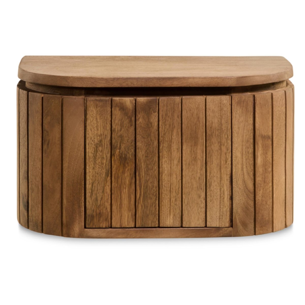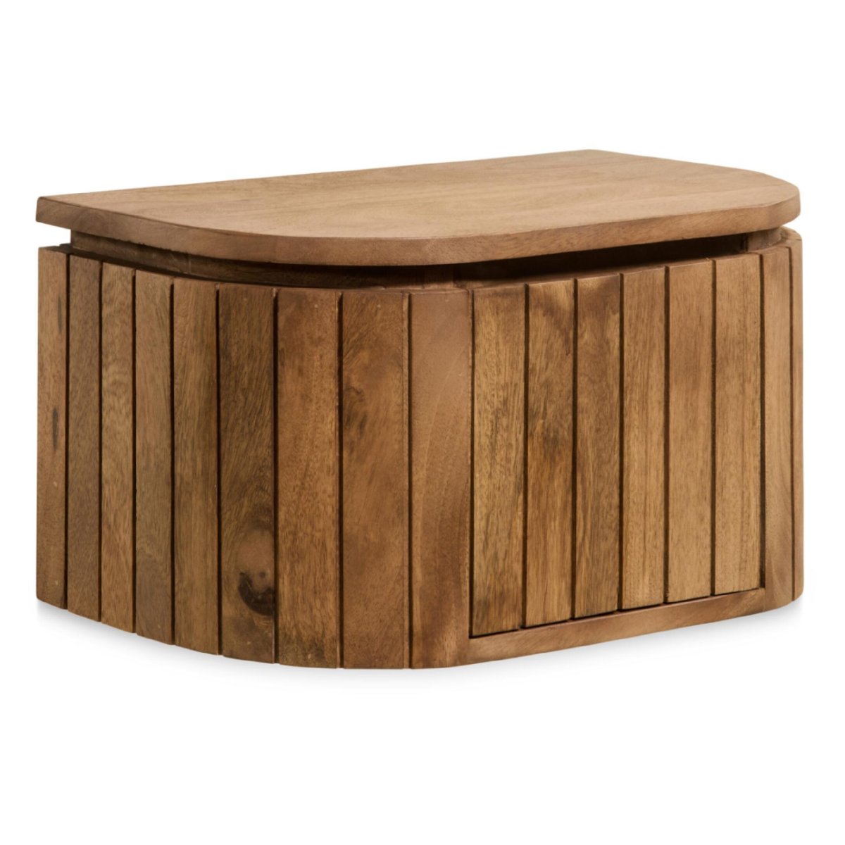 Het zwevende ontwerp van dit mangohouten nachtkastje zorgt direct voor een opgeruimde en rustige slaapkamer. Doordat de vloer vrij blijft, oogt je ruimte groter, lichter en minder vol. Bovendien kun je gemakkelijk stofzuigen of dweilen onder het kastje, zonder dat poten of randen in de weg zitten. Dit hangende nachtkastje fungeert als compact wandkastje met precies genoeg plek voor je nachtelijke essentials, terwijl het vlakke bovenblad ruimte biedt aan een leeslampje, wekker, oplader of glas water.
