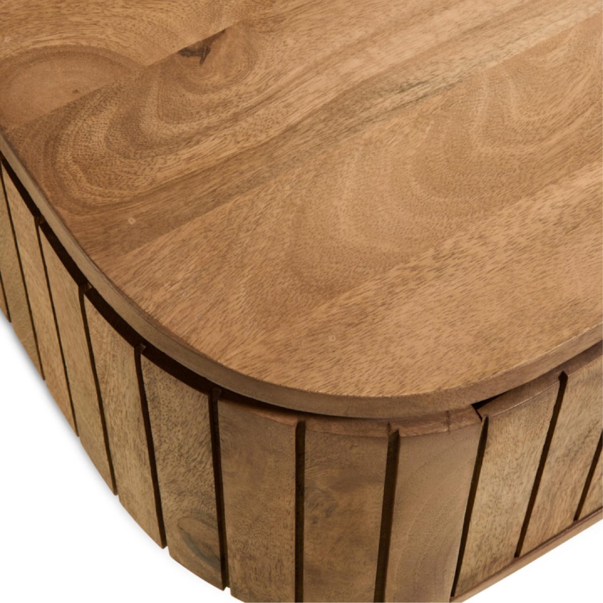 - Design: verticale latjes, afgeronde hoeken, vlak bovenblad