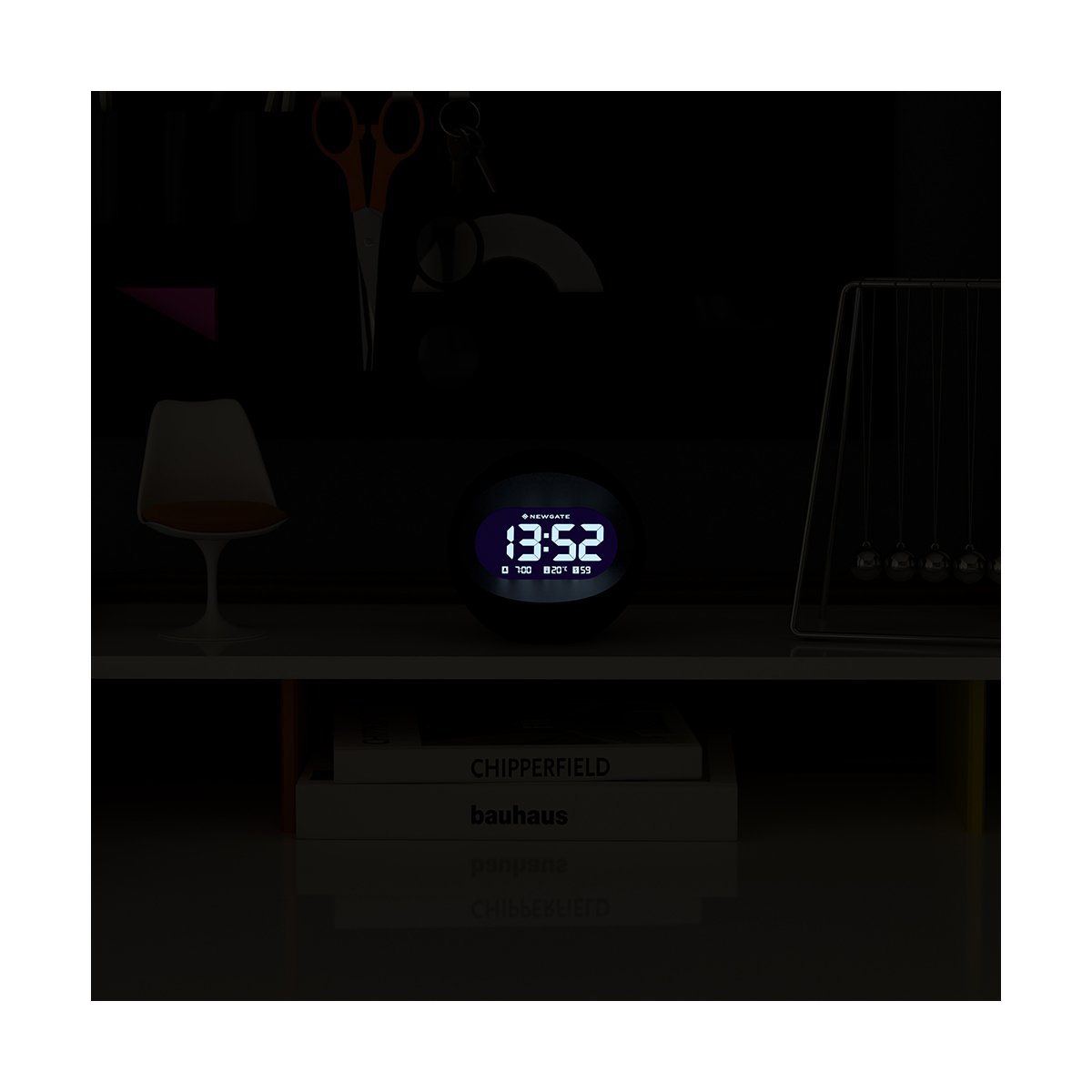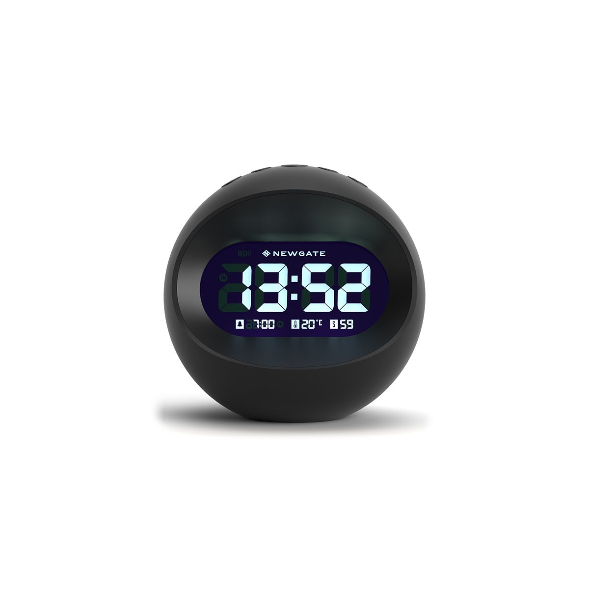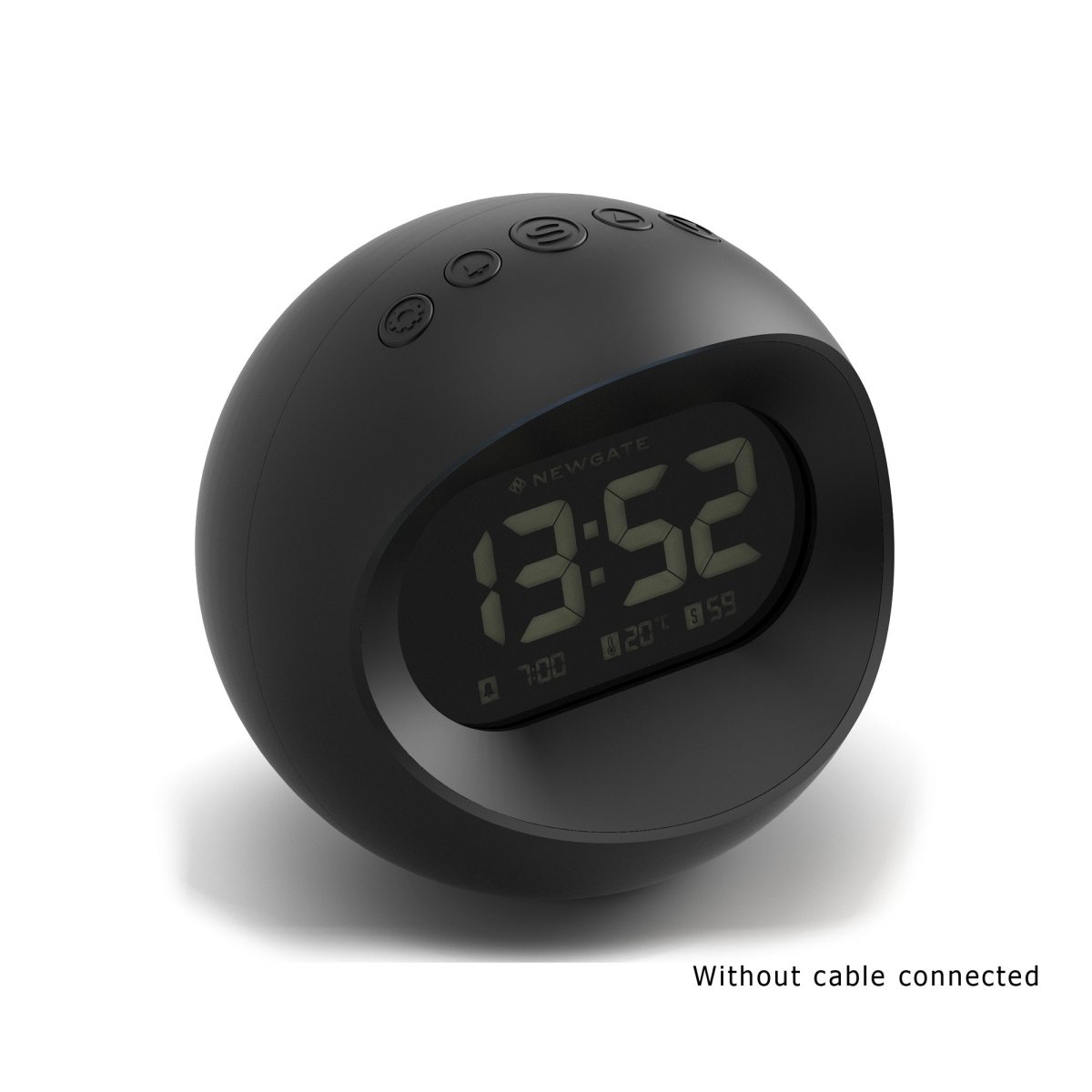 Bolvormige LCD-wekker met een strak zwart multifunctioneel scherm dat een moderne, maar toch retro toevoeging aan een kamer biedt. De door Britten ontworpen wekker heeft een weergave van 12 of 24 uur, een digitale wekker en snoozefunctie, en een temperatuurweergave. Het scherm zal minder fel zijn wanneer het alleen op batterijen werkt, maar helder wanneer je op de knop bovenop drukt, tenzij je de USB-kabel hebt aangesloten, in welk geval het scherm echt helder zal zijn.