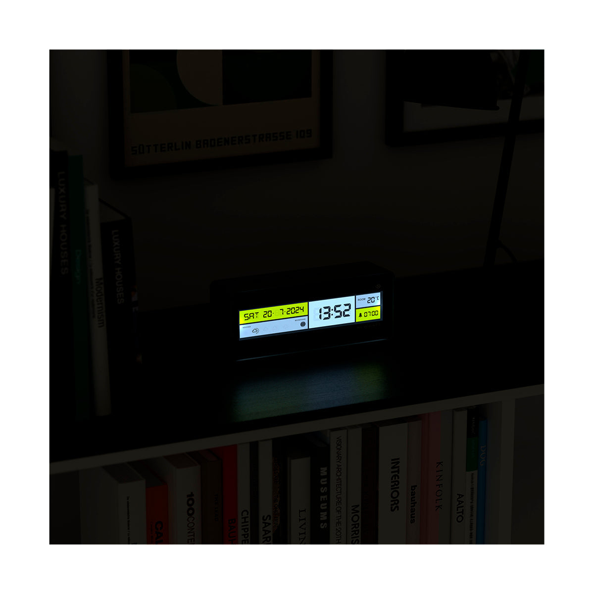 Rechthoekige LCD-wekker met een multifunctioneel scherm in een stijlvol kleurenpalet in een minimalistische stijl. Het ongebruikelijke ontwerp van de wekker heeft een weergave van 12 of 24 uur, een digitale wekker en snoozefunctie, en een temperatuurweergave.