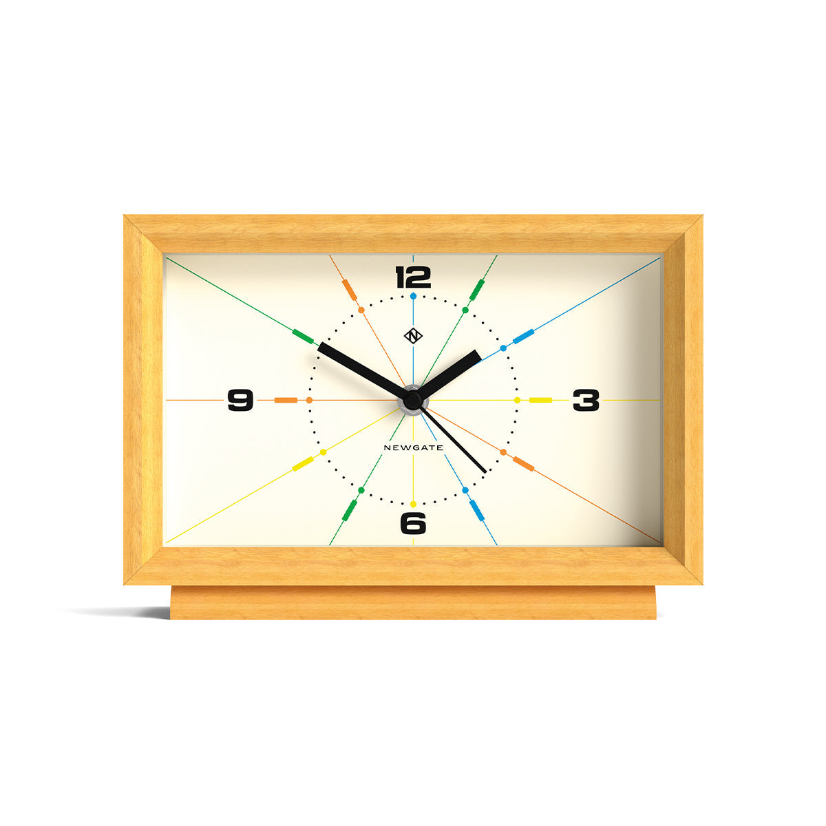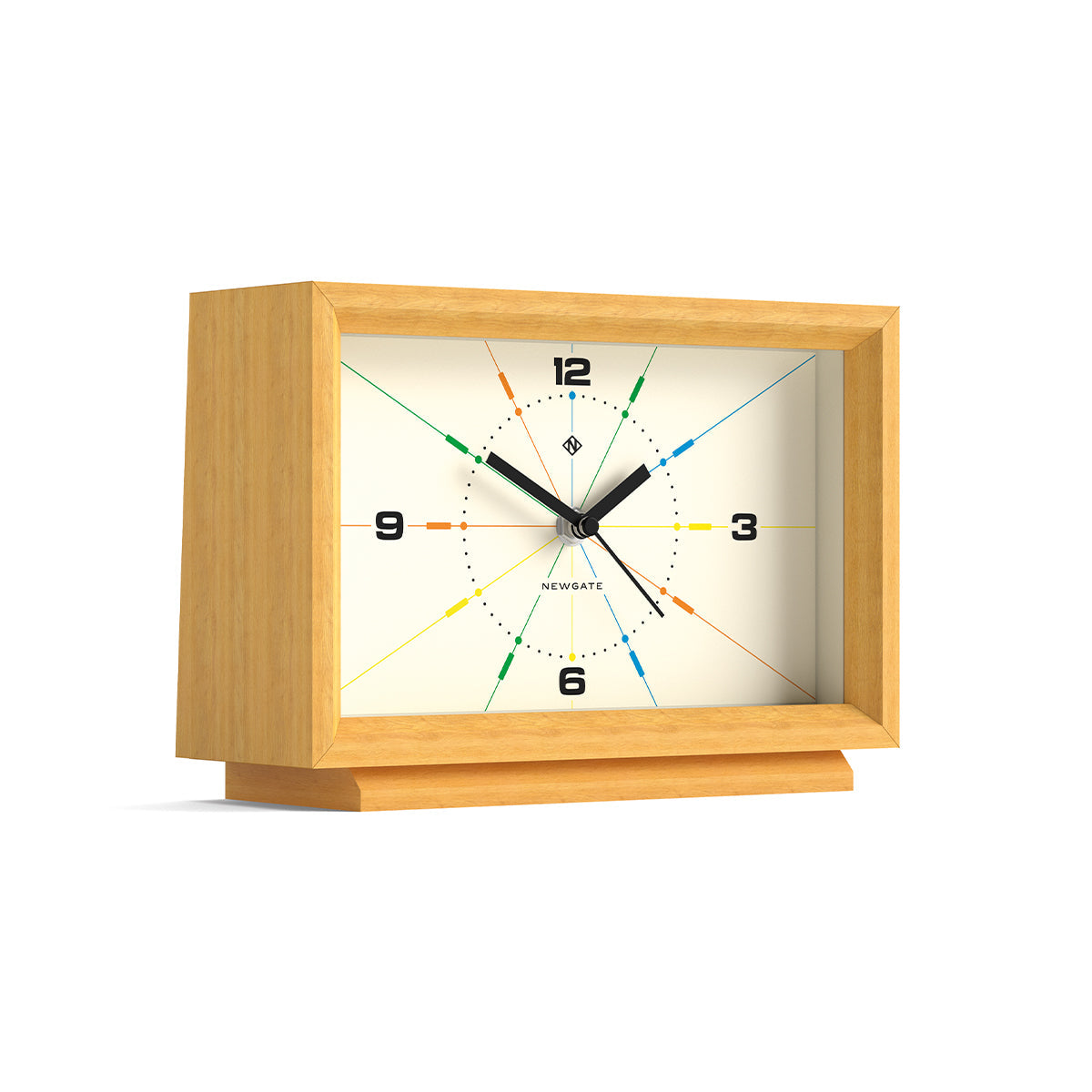 Een eigentijdse houten tafelklok vervaardigd uit massief licht eikenhout. De grafische modernistische wijzerplaat bevat met zeefdruk aangebrachte, veelkleurige uurmarkeringen gemeten door wijzers die lijken op de dirigeerstokjes van een dirigent. Bekend als ‘silent sweep’ in de industrie, bewegen de wijzers in een constante vloeiende beweging in plaats van met een stapsgewijze tik. Dus je zult geen getik horen, maar als je gehoor bijzonder gevoelig is in een volledig stille kamer, kun je een zeer zacht zoemend geluid horen. Let op, deze klok is gemaakt van echt hout, dus er kunnen lichte variaties zijn in kleur en nerf, evenals enkele natuurlijke houtknoesten, lijnen en verbindingen.