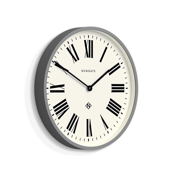 Een wandklok met Romeinse cijfers en een moderne matte grijze afwerking.