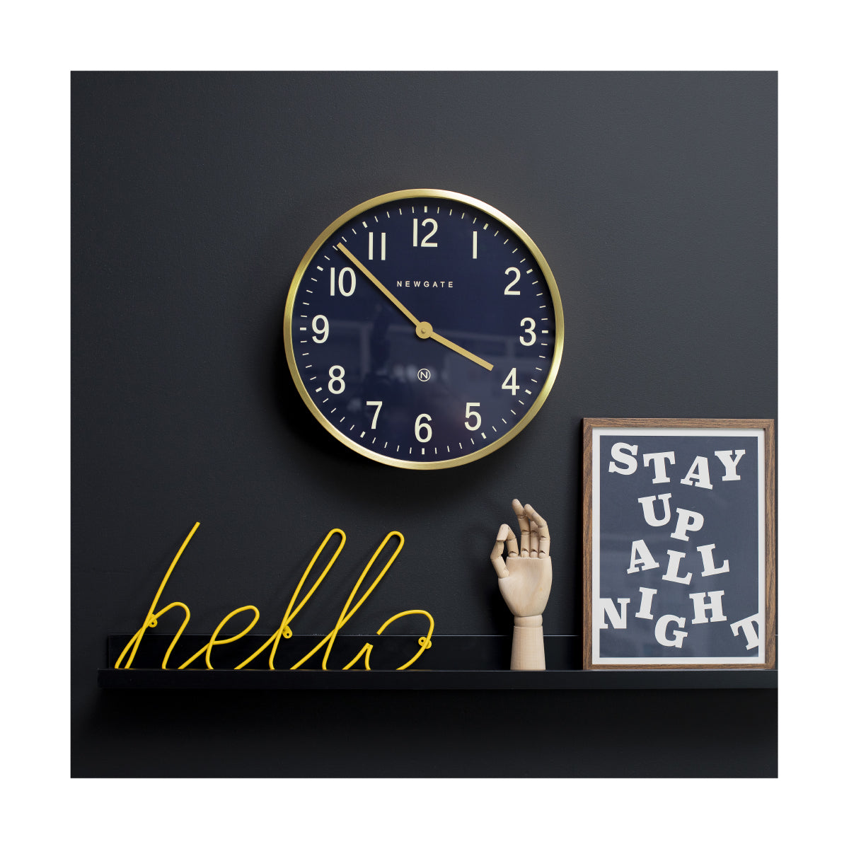 Een grote wandklok met een messing effect die modern design en mid-century stijl combineert. Een diepe, recht afgesneden radiale messing behuizing bevat een donker petroleumblauwe wijzerplaat en wijzers afgewerkt in messing.