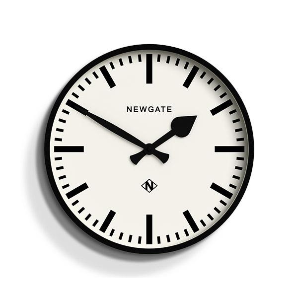 Een matzwarte stationswandklok met een opvallende markering op de wijzerplaat, zwarte spade- en stokwijzers en een minimalistische rechthoekige behuizing.