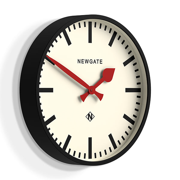 Een grote zwarte stationswandklok met een gedurfde marker-wijzerplaat, contrasterende rode wijzers en een diepe, recht afgesneden metalen behuizing met een matte zwarte afwerking.