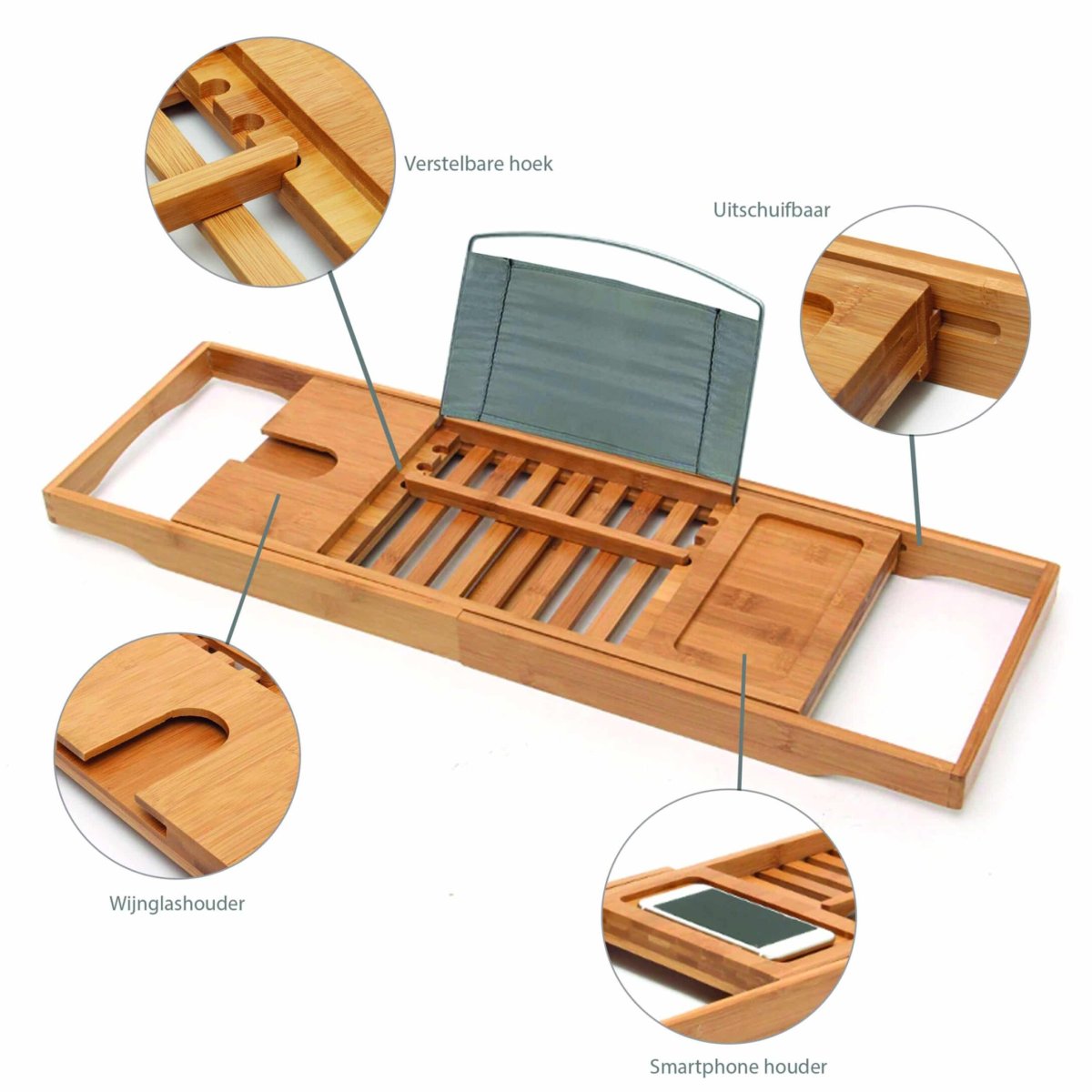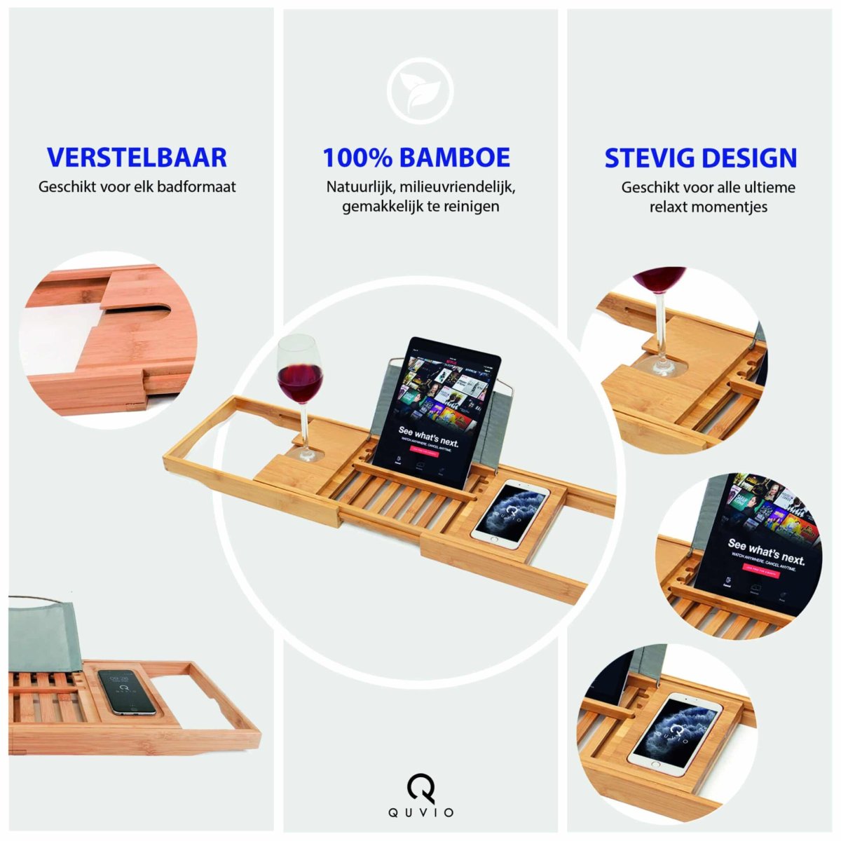 Het badrekje is uitschuifbaar van 70 tot 104 centimeter waardoor je het kan gebruiken in vrijwel ieder bad. De boekhouder op de tablet is geschikt voor elke tablet en alle gangbare maten boeken. Verder beschikt dit rekje over een glazenhouder en een vak om je smartphone veilig in op te bergen. Zo voorkom je dat de spulletjes die op je QUVIO badrekje liggen in het water terechtkomen.