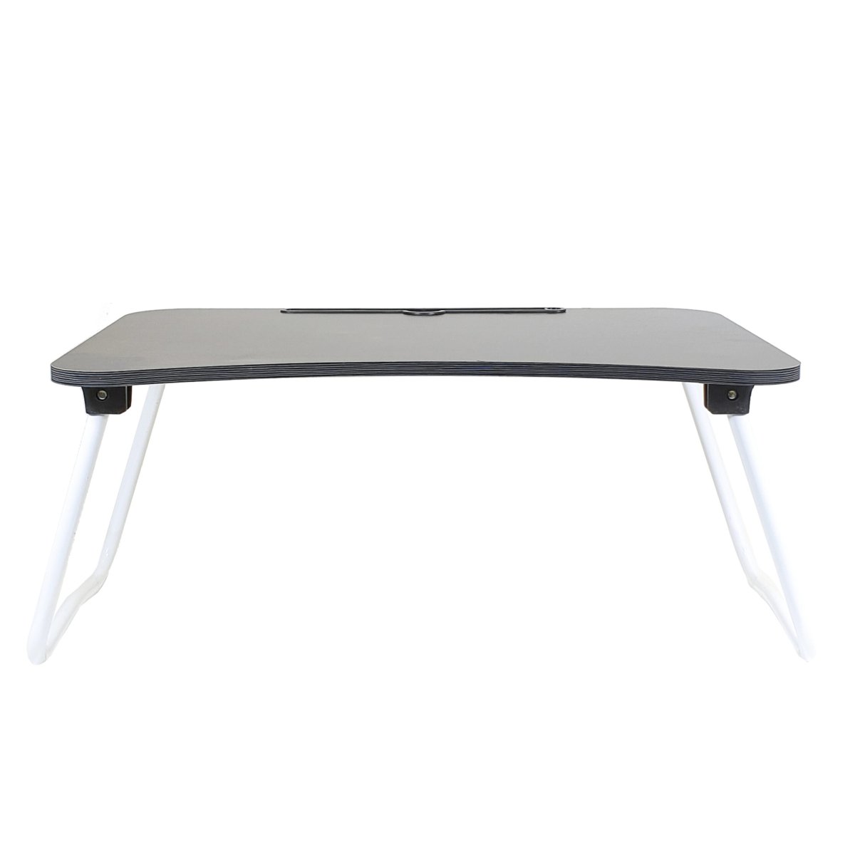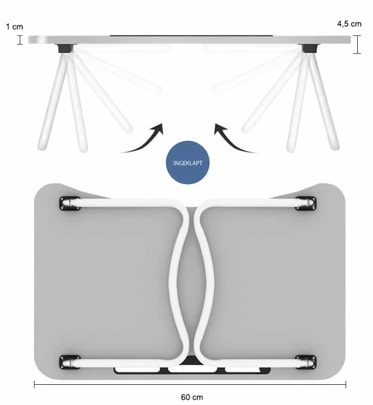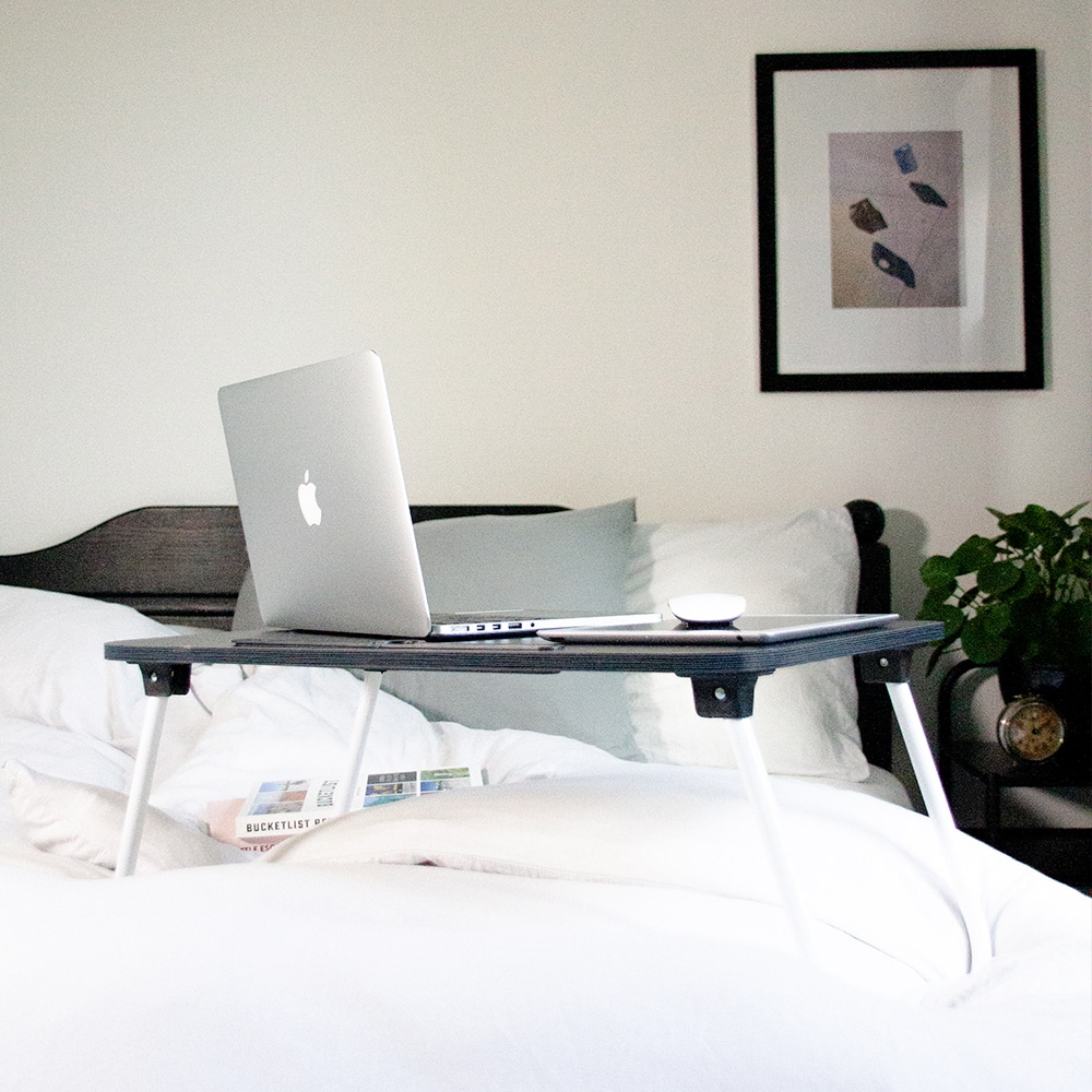 De QUVIO multifunctionele bedtafel in het zwart valt niet alleen op door zijn design, het is ook essentieel voor je laptop. Het zorgt er namelijk voor dat je laptop niet oververhit raakt. Leg je laptop niet zomaar op het bed, want het stoffen oppervlak verhindert de koeling. Plaats de tafel simpelweg over je benen in bed of op de bank. Ga je vervolgens iets anders te doen? Berg de laptoptafel dan gemakkelijk op. De poten zijn opvouwbaar. De inklapbare bedtafel is voorzien van een gleuf voor tablets. Deze kunnen rechtop geplaatst worden, wat het vlot werken maakt. Is de batterij bijna leeg? Er is een opening voor oplaadkabels. Niets houd je dus tegen om te werken of te studeren! Stoot je in volle strijd per ongeluk je glas om?  Het gelamineerde oppervlak van deze multifunctionele bedtafel in het zwart vermijd het intrekken van eventuele vlekken. Met andere woorden, dit tafeltje is kidsproof! Een extra tip: doop de tafel om tot bijzettafel voor de jongste.