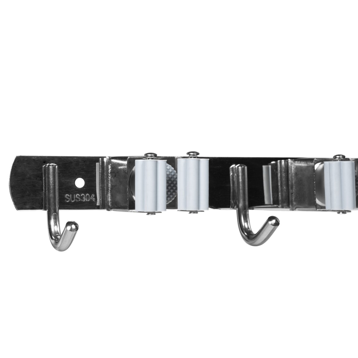 Deze bezemhouder met 3 klemmen en 4 haken kun je eenvoudig aan de muur bevestigen. Dit kun je met schroeven doen, maar het is ook mogelijk om de houder aan de muur te plakken. Zo hoef je niet eens gaten te boren in de muur. Het ophangsysteem heeft 3 klemmen. Deze steelhouders zijn geschikt voor de meest gangbare bezemstelen en dweilstokken. De haken zijn aan de binnenkant bekleed met siliconen. Hierdoor zullen de materialen goed blijven hangen. De bezemklem wordt steeds afgewisseld met een haak. Deze zijn handig voor bijvoorbeeld stoffer en blik, maar ook handdoeken, schoonmaakdoekjes of tuingereedschap kun je hier prima op kwijt. Alles is makkelijk op het bezemophangsysteem te plaatsen en ook weer te verwijderen. door de bezemhouder met 3 klemmen hangt alles overzichtelijk naast elkaar, waardoor je geen tijd meer kwijt bent aan het zoeken van het juiste gereedschap.