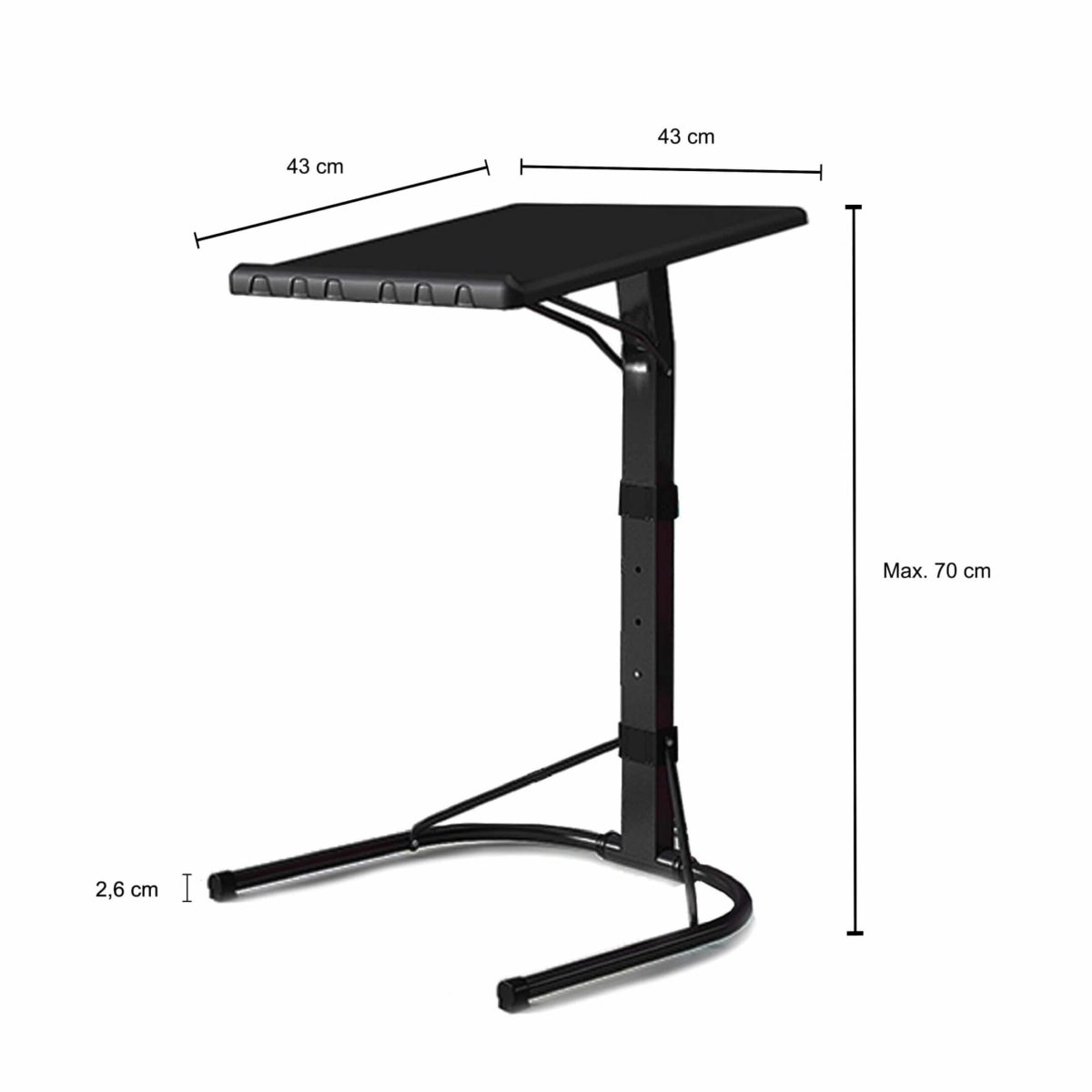 Zet de verstelbare laptoptafel in het zwart eenvoudig naar jouw hand. Duw het tafelblad in de juiste hoek (90° verstelbaar) en schuif de desk uit tot de gewenste hoogte. Op z’n hoogst is de verstelbare tafel 70 centimeter hoog. Met gewicht kan dit tafeltje goed over weg. De inklapbare tafel verdraagt tot 18 kilogram zonder gebukt te gaan onder het gewicht. De draagbare bureau is een pluimpje om te dragen en vouw je in vier stappen open. Zo kan je er overal mee lopen. Daarnaast neemt de verstelbare laptoptafel in het zwart weinig ruimte in en staat hij dus voor niemand in de weg!