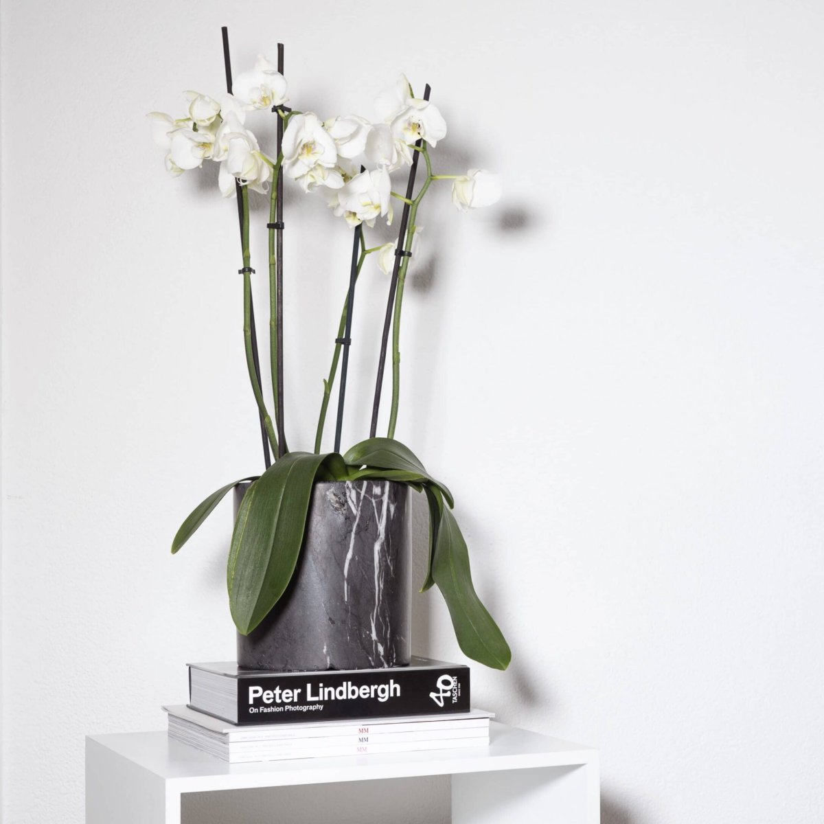 Een bloempot in het marmer zwart zorgt voor extra stijl
