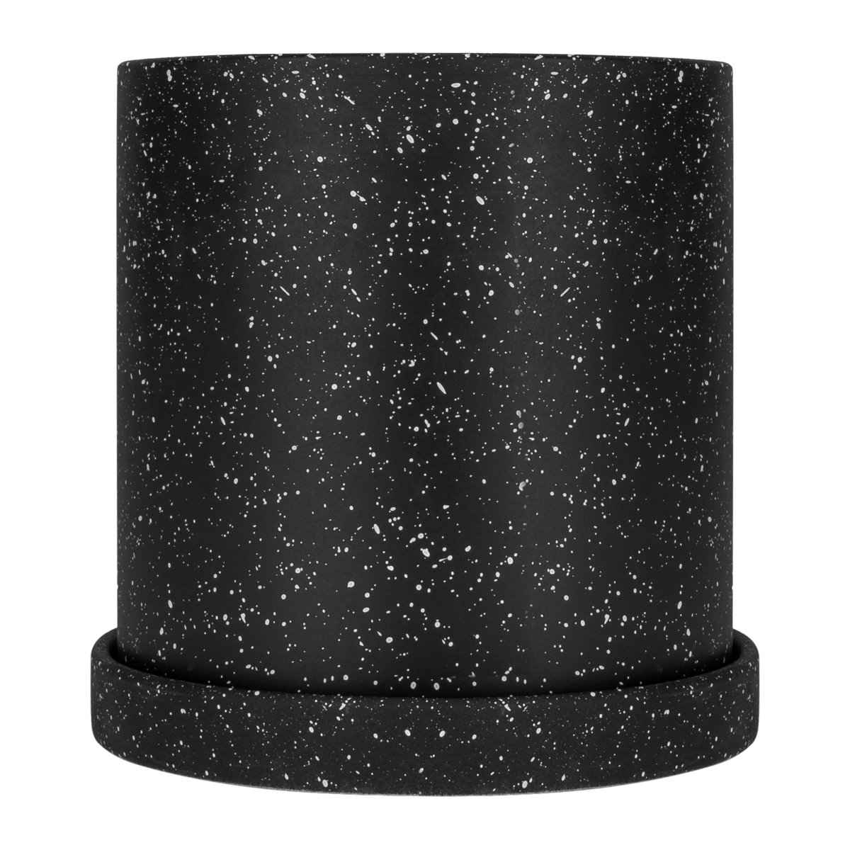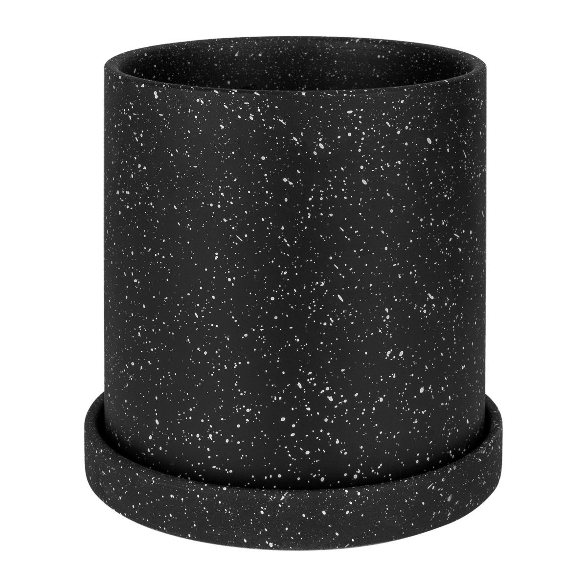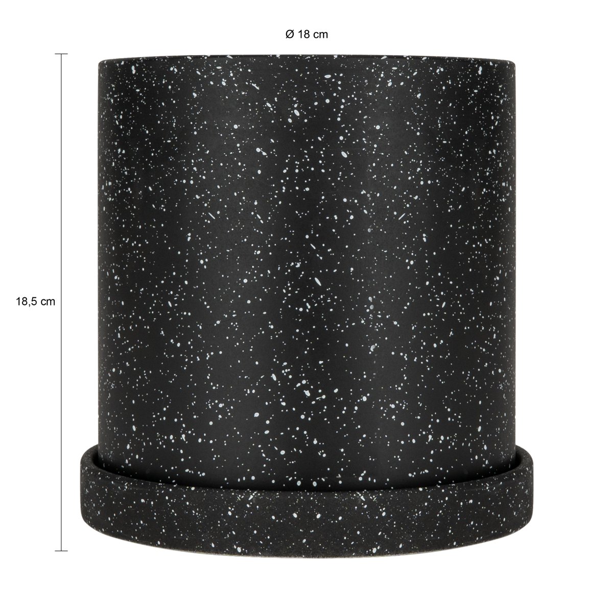 De decoratieve bloempot is zwart en heeft witte spikkels. Dit zorgt voor een mooi effect en geeft de zwarte bloempot van keramiek een elegantere uitstraling. De bloempot staat op een schaal, waardoor de onderkant een bredere rand lijkt te hebben. De decoratieve bloempot is gemaakt van keramiek.