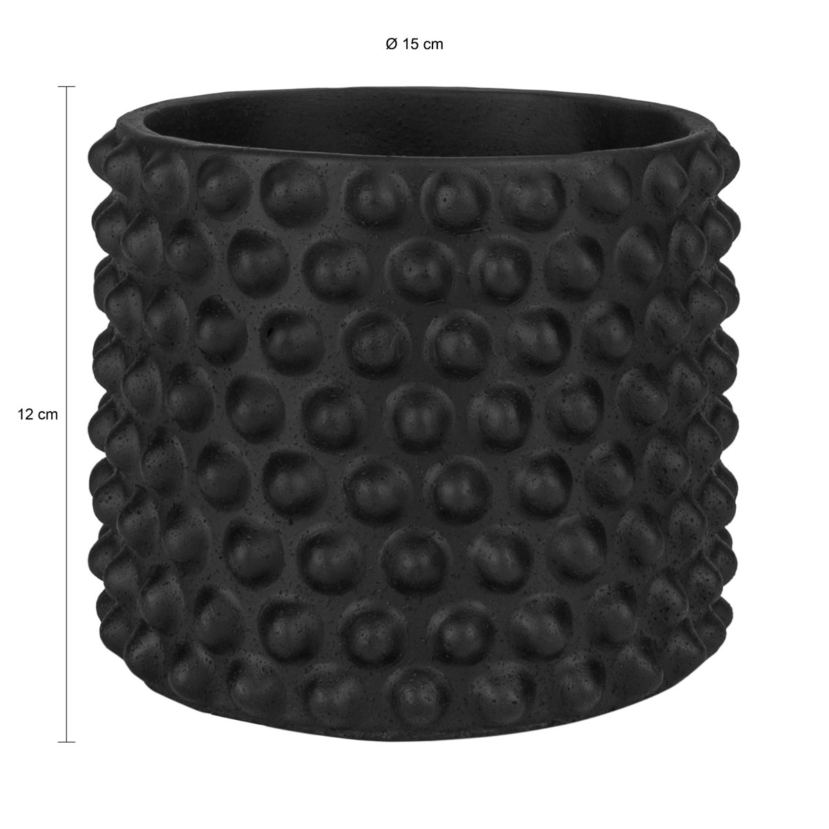 Een bloempot geeft je planten direct een nieuwe uitstraling. Bloempotten zijn daarom ook belangrijke woonaccessoires. Neem bijvoorbeeld deze opvallende betonnen bloempot met bolletjes. Niet alleen het materiaal maakt deze bloempot uniek, ook de bolletjes die rondom de hele pot zitten vallen meteen op. Het maakt van de zwarte bloempot een stoere verschijning. Daarom past deze bloempot goed in verschillende woonstijlen. Daarbij is deze bloempot leuk te stijlen in je woonkamer, slaapkamer, maar hij zal ook je badkamer een unieke uitstraling geven.