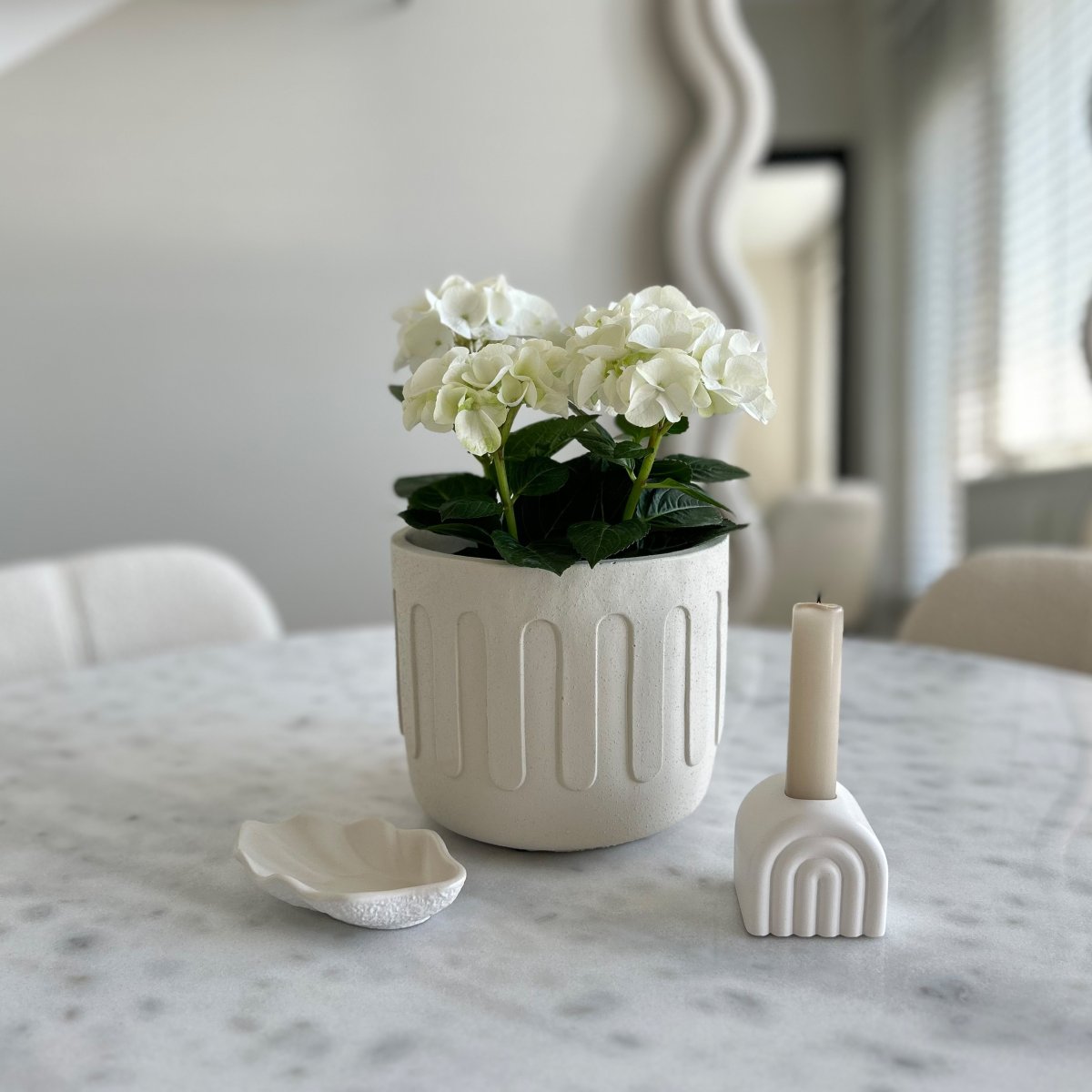 Het ontwerp van deze bloempot van beton met druppels is erg geschikt voor diverse woonstijlen. Het beton en de beige kleur geven de pot een neutrale uitstraling, die zich eenvoudig aanpast aan de omgeving. Zo zet je deze pot in een modern interieur, maar ook in een landelijk of minimalistisch interieur past de bloempot uitstekend. Deze bloempot is een perfecte toevoeging voor je woonkamer, slaapkamer en zelfs je woonkamer. Dat maakt van deze Betonnen bloempot met drips een aanwinst voor in elke woning.
