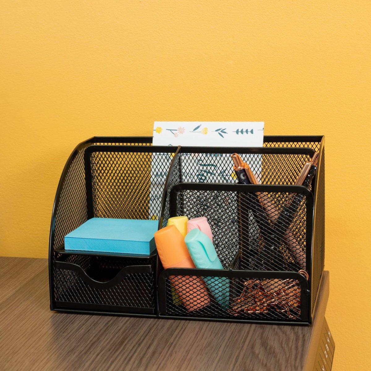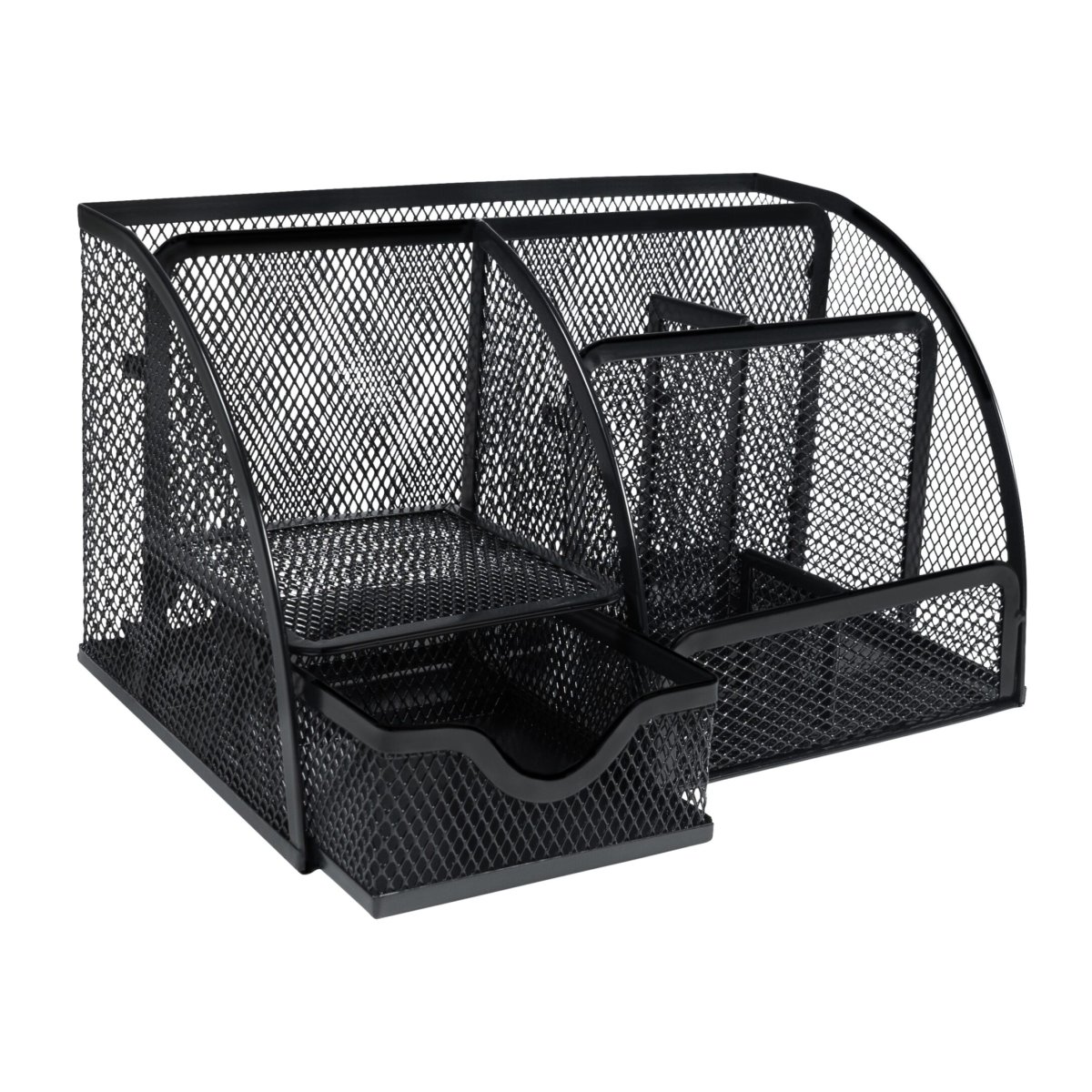 Ben je op zoek naar een manier om je pennen, kladblokken en blaadjes op te bergen? Deze bureau organizer in het zwart helpt je bij het hebben van een geordend bureau, waarop je altijd alles kunt vinden. Dankzij de zes compartimenten en een lade, hebben al je accessoires een vaste plek. De draadstalen bureau organizer is duurzaam en zorgt ervoor dat je spullen makkelijk toegankelijk zijn.