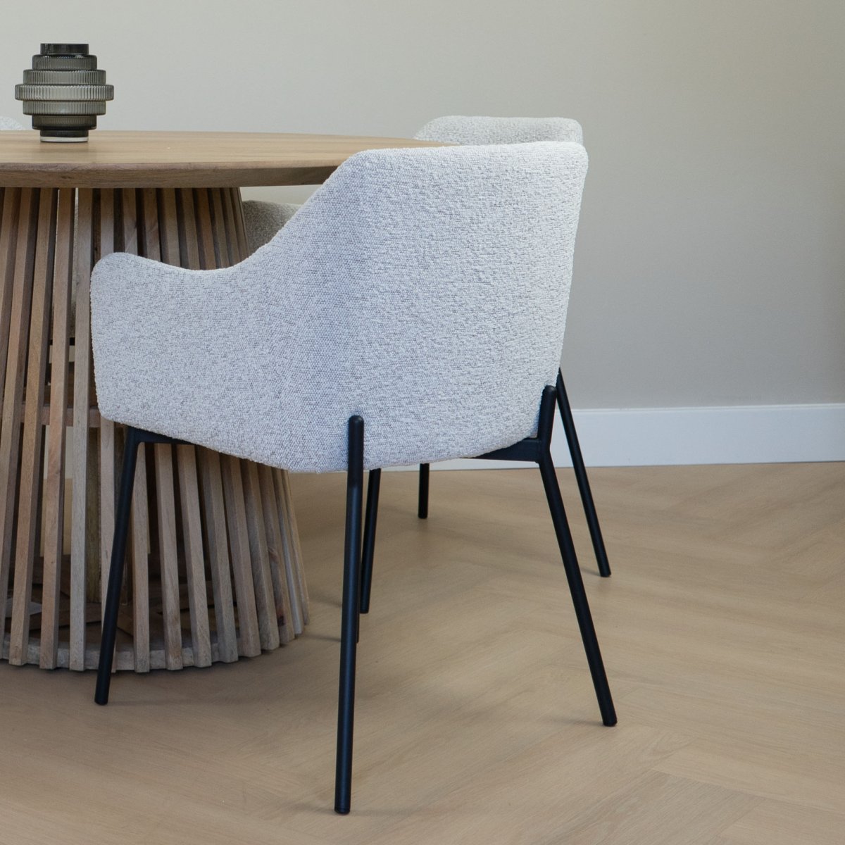 Deze eetkamerstoel is bekleed met hoogwaardige bouclé stof, wat een zachte en luxe uitstraling geeft. Bouclé is populair vanwege zijn duurzaamheid en het gemak waarmee je de stof kunt onderhouden. Ideaal voor dagelijks gebruik in een druk huishouden, zonder in te leveren op comfort en stijl.