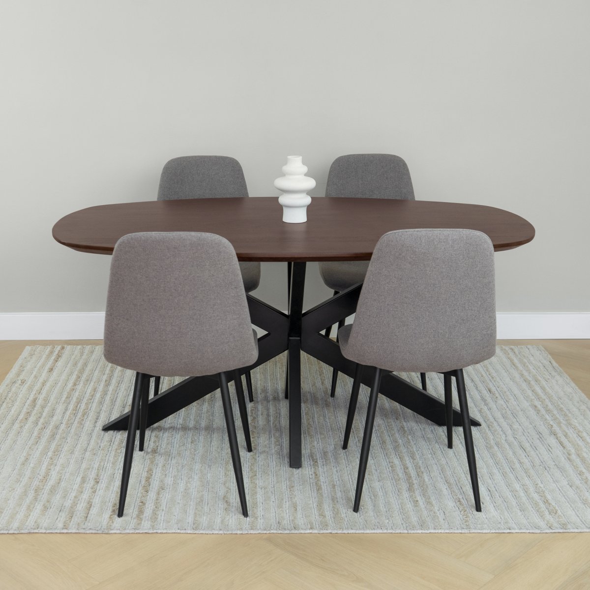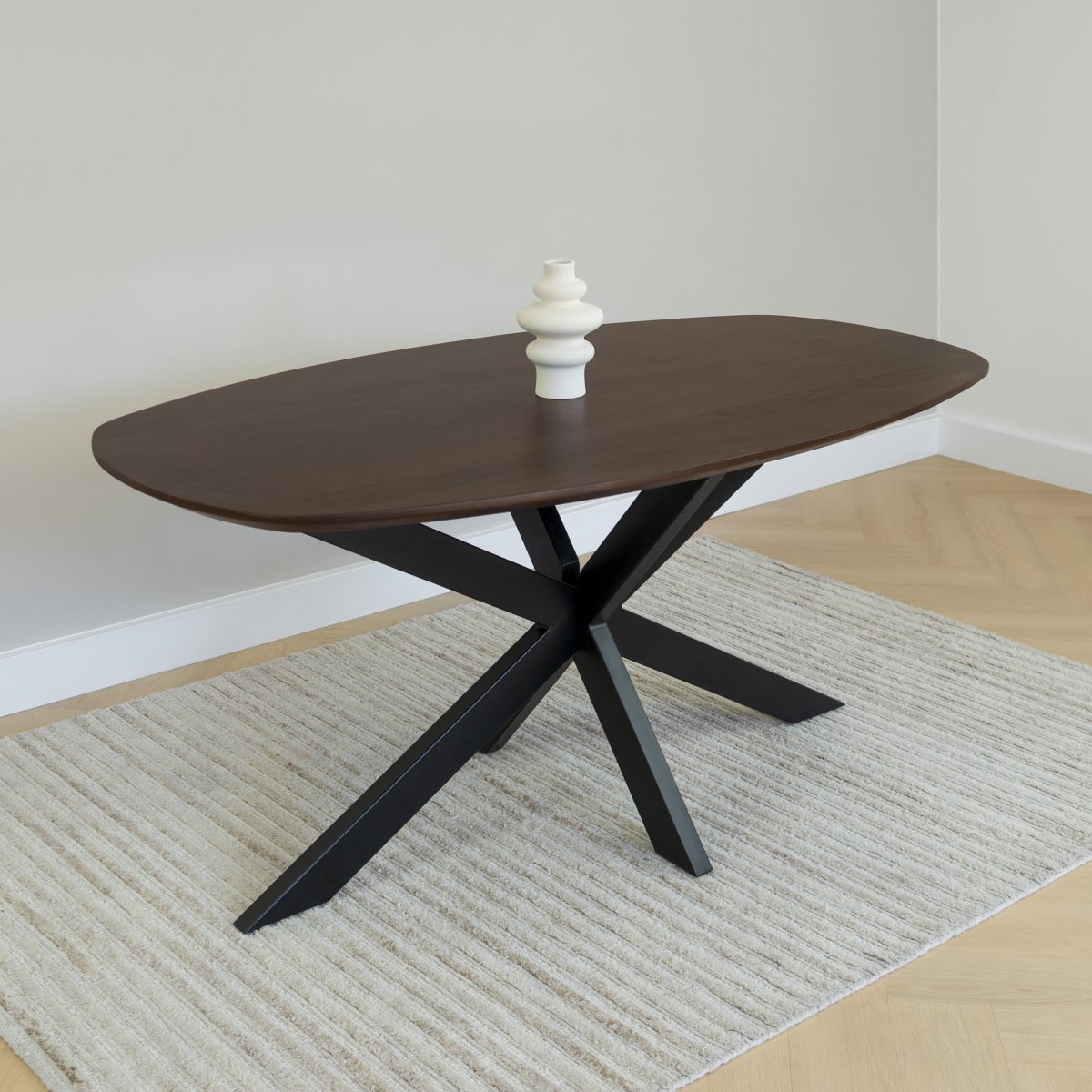 Gezellig dineren aan een elegante walnoot bruine eettafel met stalen kruispoot