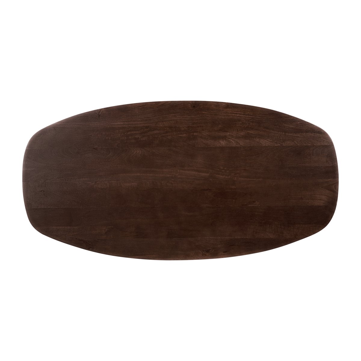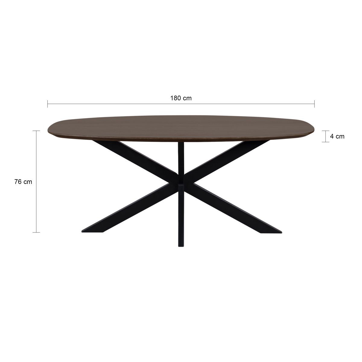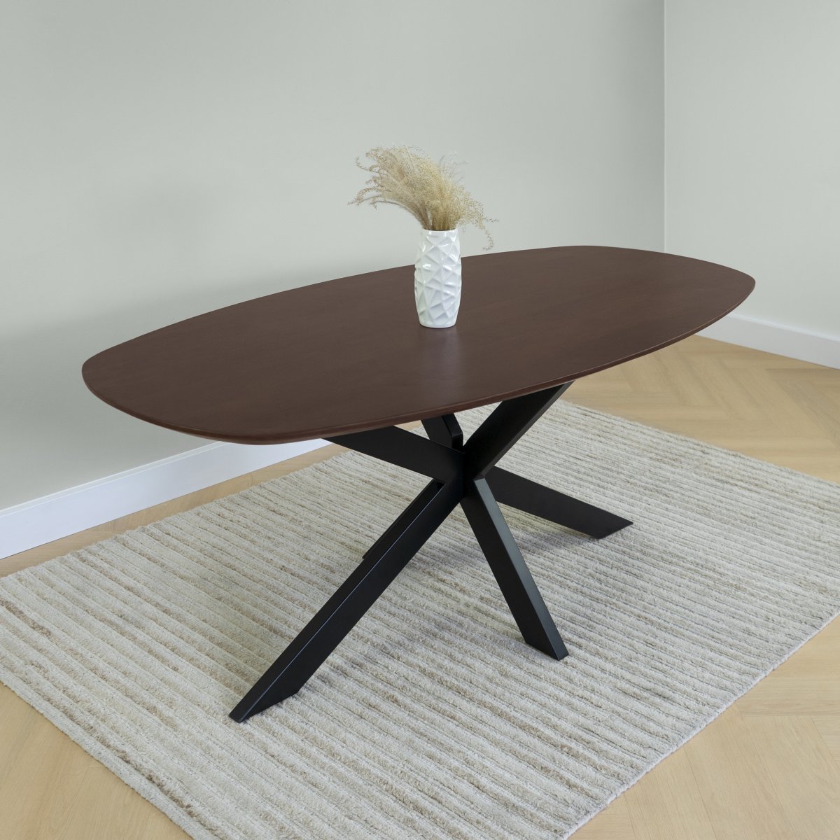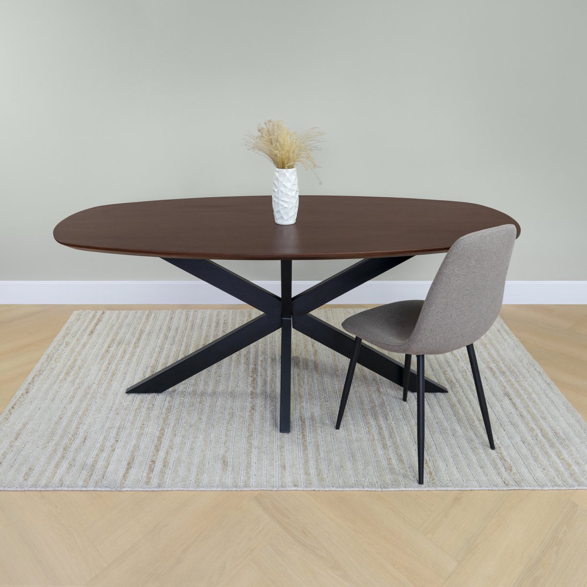 Breng karakter in je eetruimte met de eettafel Sofia. Deze prachtige eettafel is vervaardigd uit FSC®-gecertificeerd mangohout en afgewerkt in een warme walnoot bruine tint. De stevige stalen kruispoot vormt een krachtig contrast met het natuurlijke hout, wat zorgt voor een modern en tegelijkertijd sfeervol geheel. Dankzij de royale afmeting van 180×90 cm en het Deens ovale blad biedt deze tafel voldoende ruimte voor gezellige etentjes met vrienden of familie.