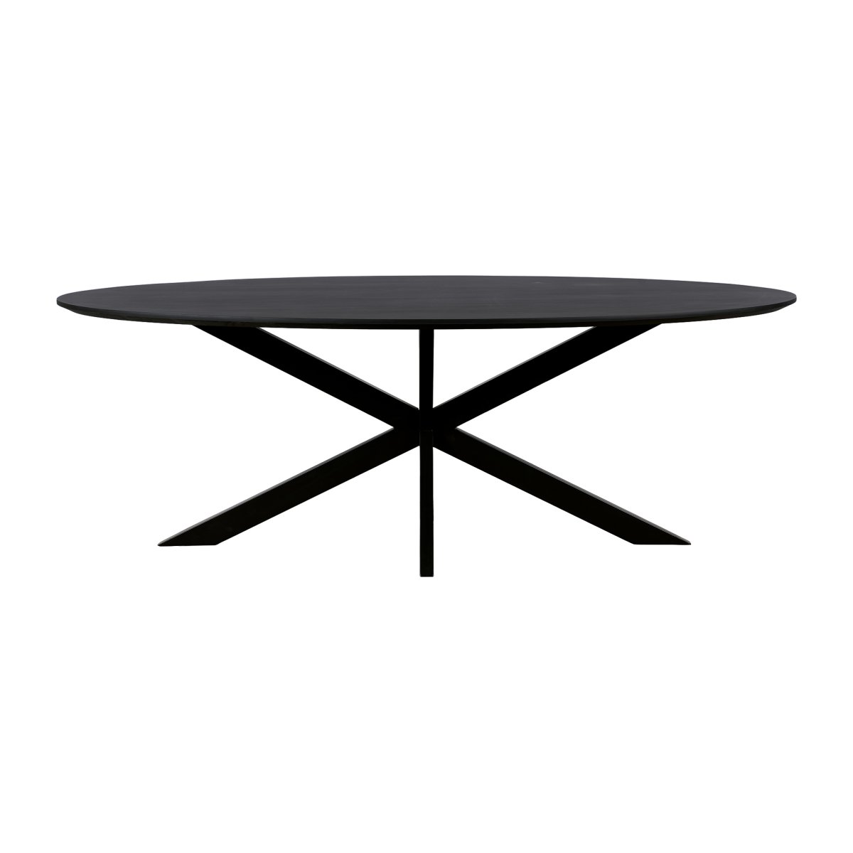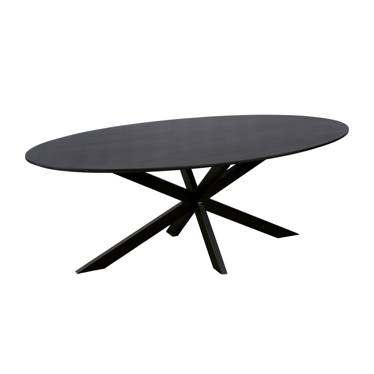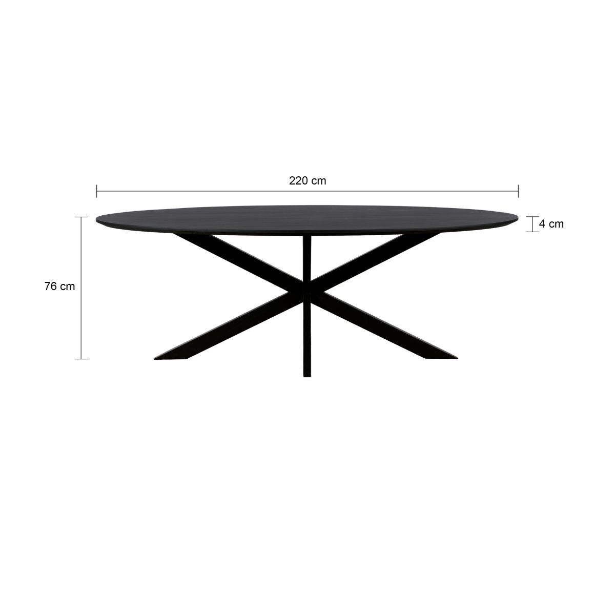 Het unieke ontwerp van de stalen kruispoot, ook wel bekend als een matrix tafelpoot, geeft de mangohout eettafel een eigentijdse en stijlvolle look. De combinatie van het zwarte stalen onderstel en het donkere mangohouten blad maakt deze tafel een veelzijdige keuze die in verschillende interieurstijlen past, van industrieel tot modern. Plaats de zwarte mangohouten eettafel ovaal 220x100cm centraal in de eetkamer voor een indrukwekkende blikvanger die direct de aandacht trekt.