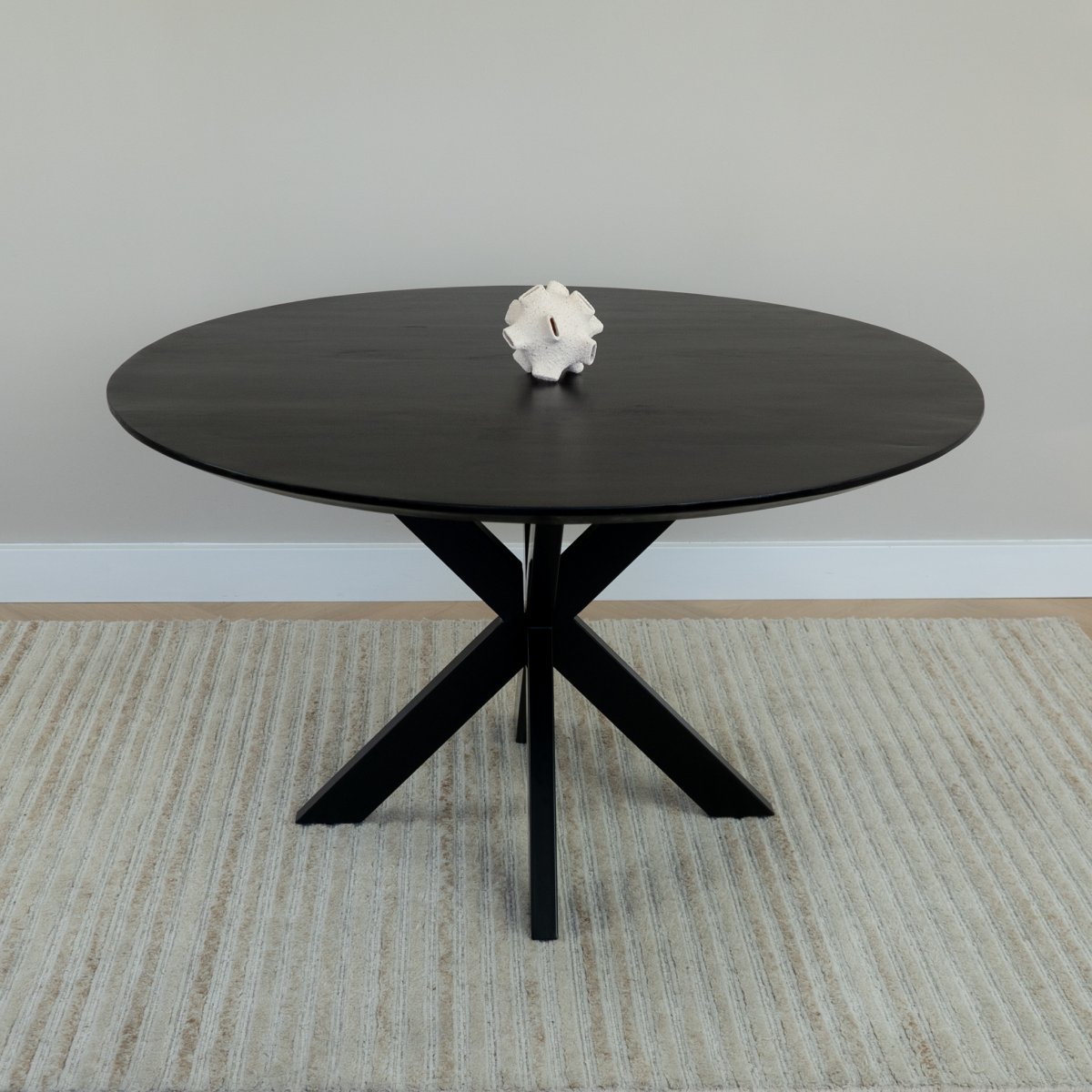 Met een diameter van 130 cm is deze ronde eettafel groot genoeg voor gezellige diners zonder te overheersen in de ruimte. Het contrast tussen het donkere stalen onderstel en het natuurlijke mangohoutblad creëert een stijlvolle uitstraling, ideaal voor wie zoekt naar een eettafel rond met karakter en veelzijdigheid.