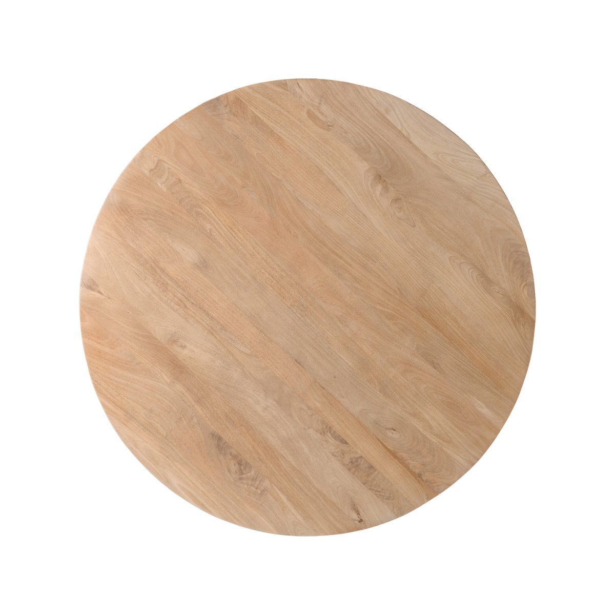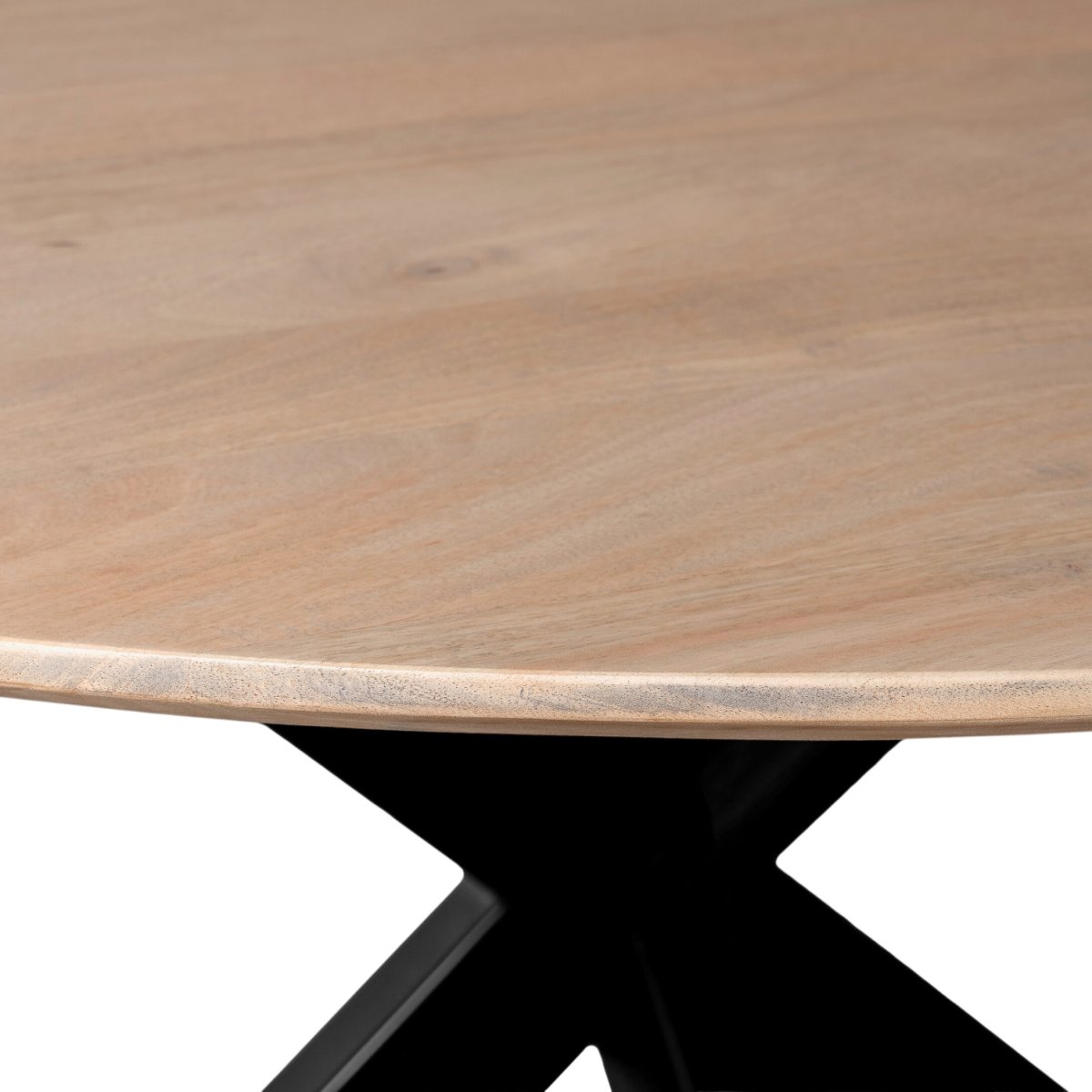 De combinatie van het natuurlijke mangohout met een zwarte kruispoot van staal geeft de tafel een robuuste en toch verfijnde uitstraling. Het ontwerp is modern, tijdloos en sluit naadloos aan bij diverse interieurstijlen zoals industrieel, Scandinavisch en eigentijds. De ronde vorm zorgt bovendien voor een zachte balans in strakke of open ruimtes.