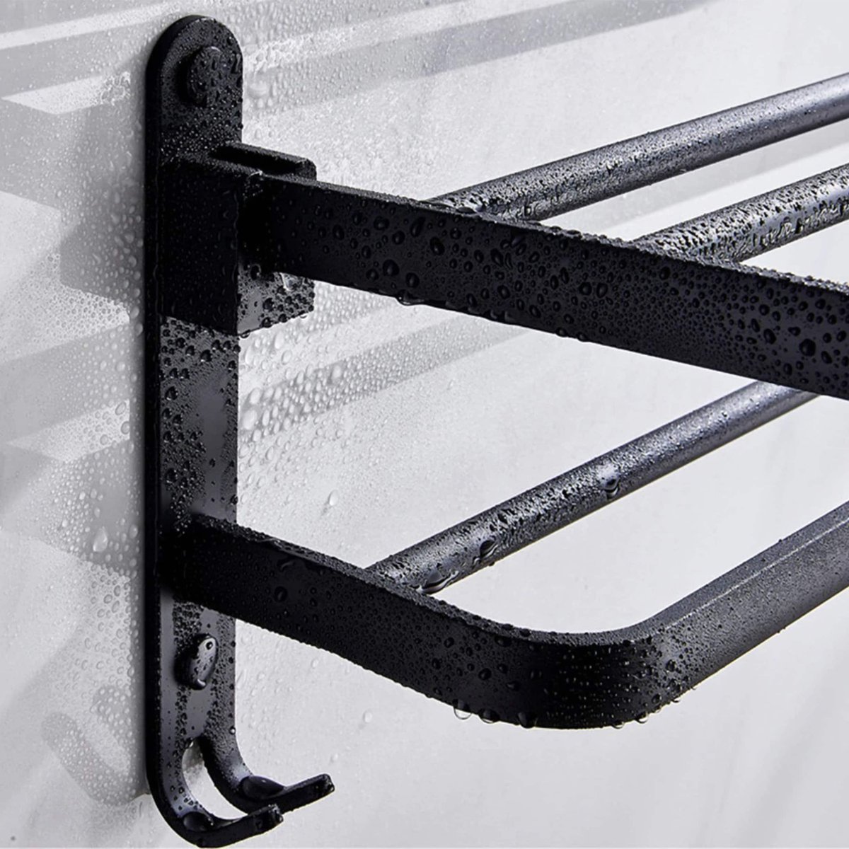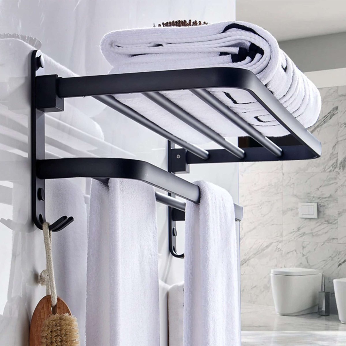 Dit QUVIO handdoekrek van staal heeft een strakke look en een zwarte afwerking. Je krijgt met dit rek zowel een wandplank om je propere handdoeken te stapelen als een rek om je handdoeken te drogen. Aan de haakjes onderaan het rek kun je bijvoorbeeld een massagehanddoek of een badborstel kwijt. De afmetingen zijn 21,5 x 60 x 19,5 cm (lxbxh).