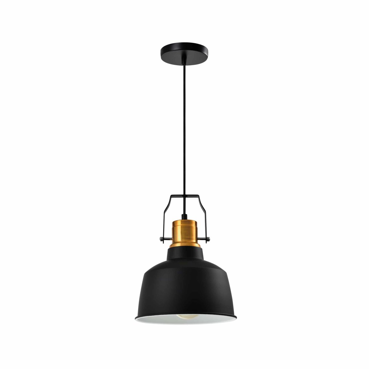 Het kleine model van de industriële hanglamp is zwart met klein gouden gedeelte. Het stuk tussen het snoer en het bredere gedeelte van de lampenkap is goud. Dit geeft de plafondlamp een elegantere uitstraling. Rondom het gouden gedeelte zie je een zwart hoekig frame dat zorgt voor een ruwere look. De industriële hanglamp trekt dankzij deze details de aandacht in de ruimte.