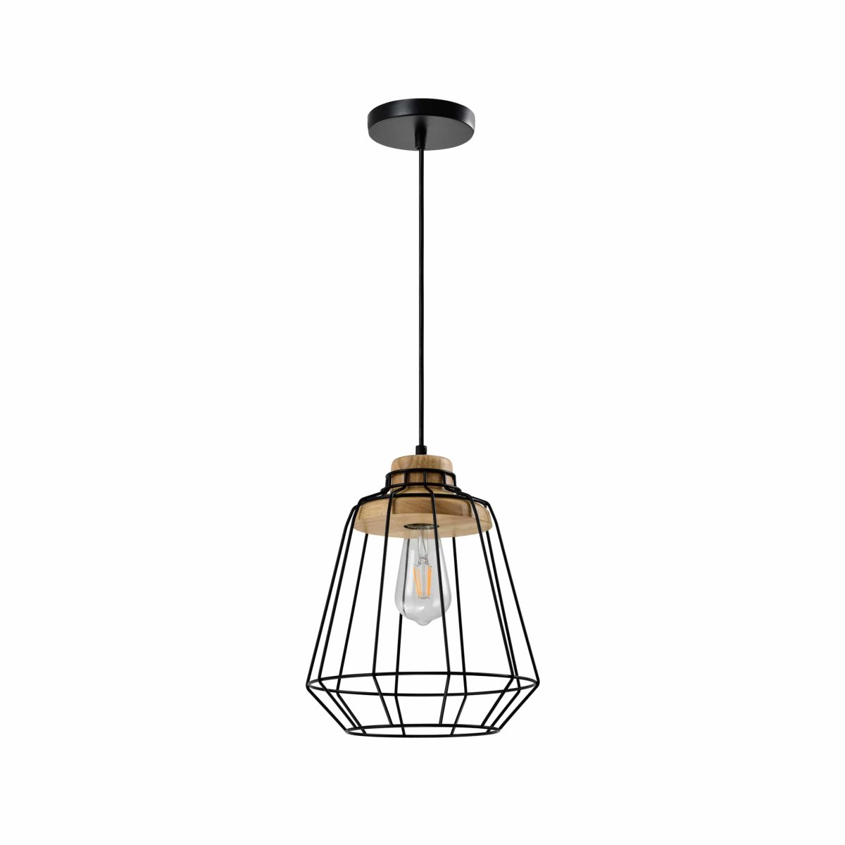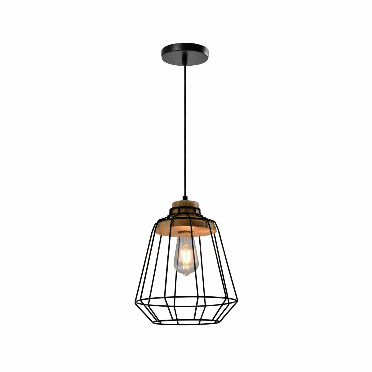 De landelijke hanglamp is gemaakt van verschillende materialen. Het frame is gemaakt van metaal in een zwarte kleur en heeft een minimalistische look. De ledlamp wordt in een houten gedeelte gedraaid. Dit lichtere hout geeft de plafondlamp een landelijke uitstraling. Het snoer en gedeelte aan het plafond zijn zwart van kleur.