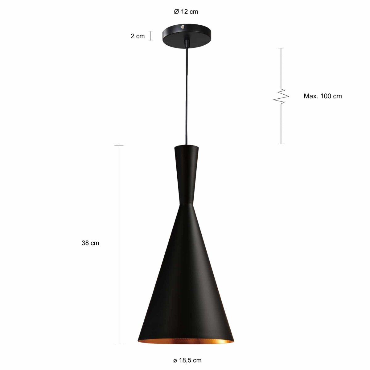 Een design hanglamp in huis, kantoor of in een bedrijfskantine gebruiken, kan de sfeer in de desbetreffende ruimte direct positief veranderen. Dat geldt zeker voor deze strak ontworpen, industrie hanglamp met koperen binnenkant. Deze zwarte design hanglamp valt op door zijn stoere langwerpige vorm, waarmee deze lamp meteen de aandacht naar zich toetrekt. Daarbij zorgt de goudkleurige binnenkant van deze hanglamp voor een fraai visueel effect en een indrukwekkend mooi lichtkleur. De afmeting van de QUVIO lampenkap is 18,5 x 18,5 x 38 cm (lxbxh). De maximale snoerlengte is 100 cm en kunt u eenvoudig inkorten indien nodig.