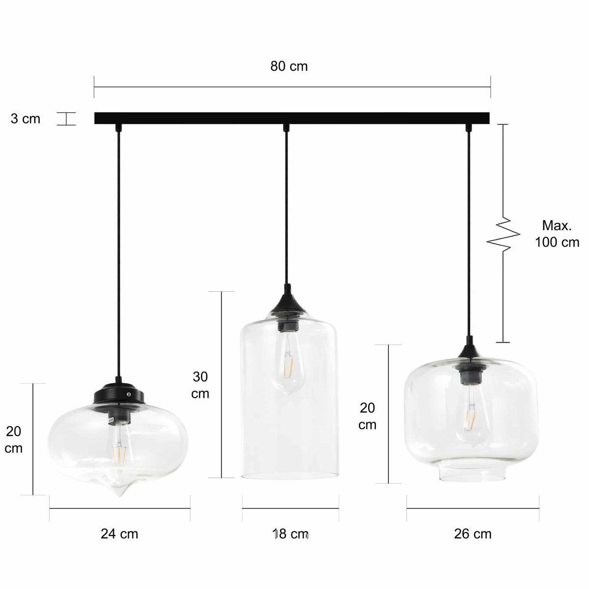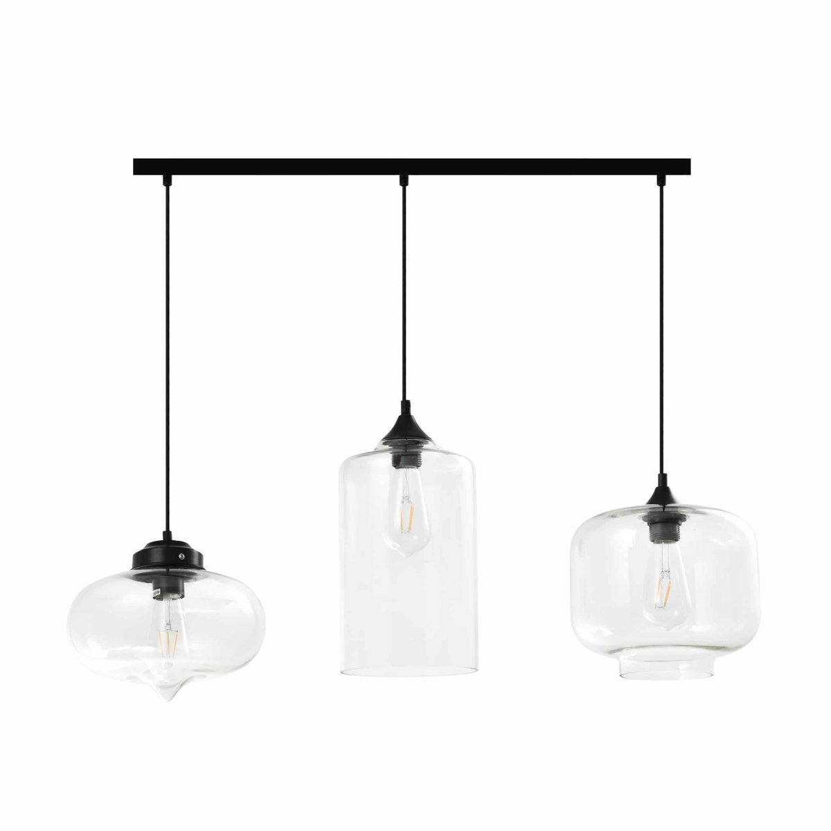 Retro hanglamp met drie glazen vormen in verschillende afmetingen
