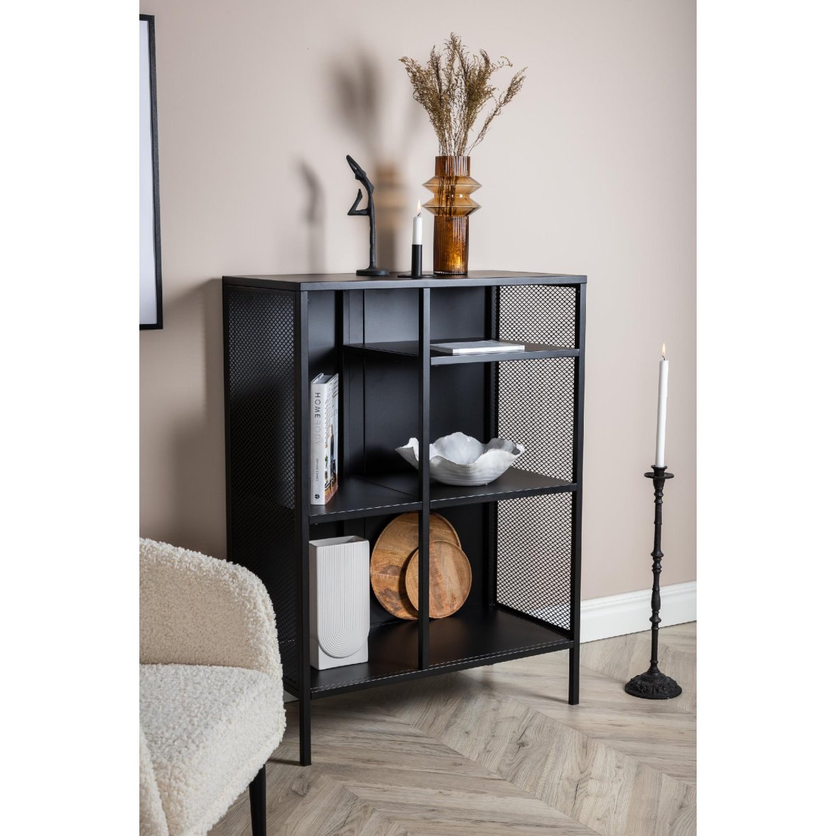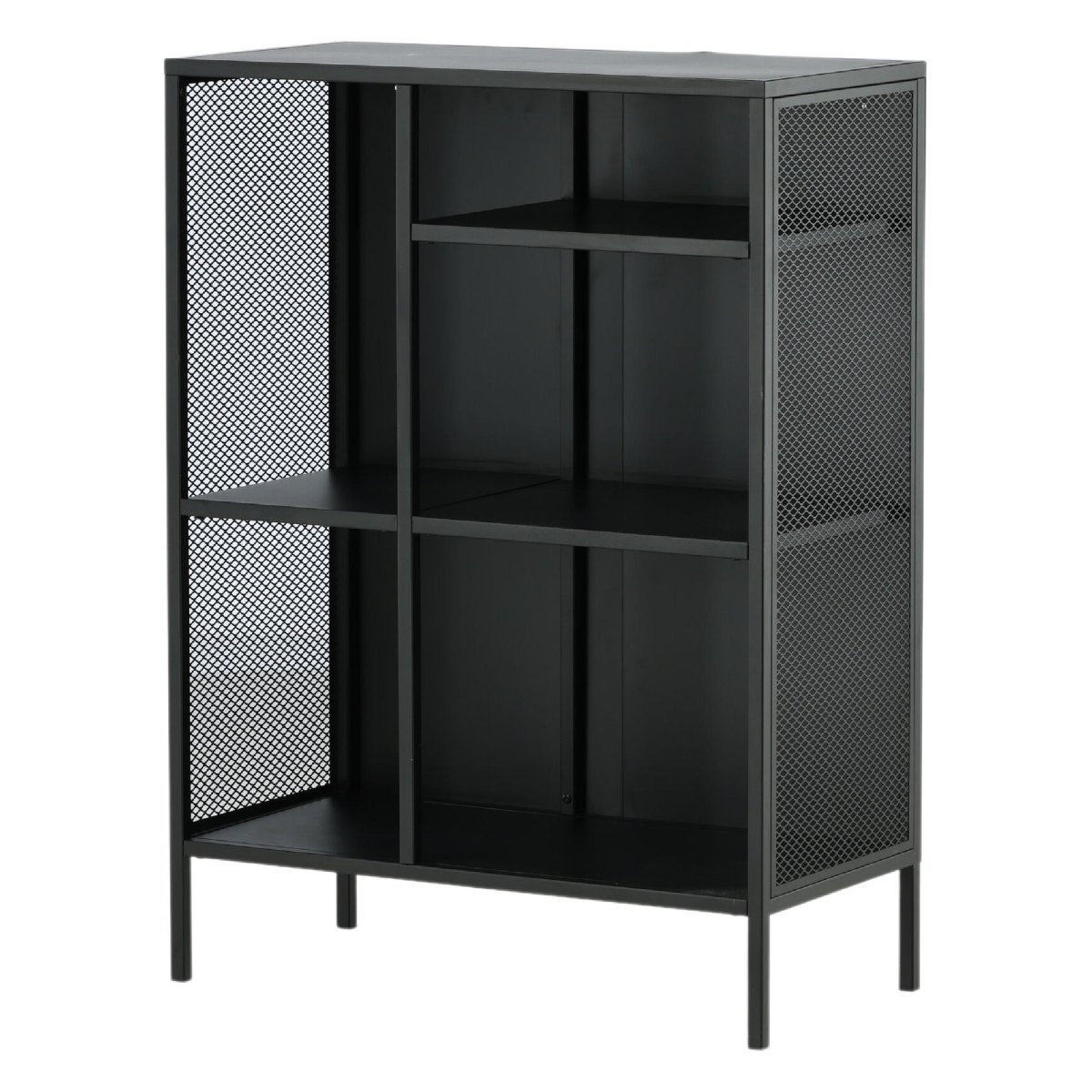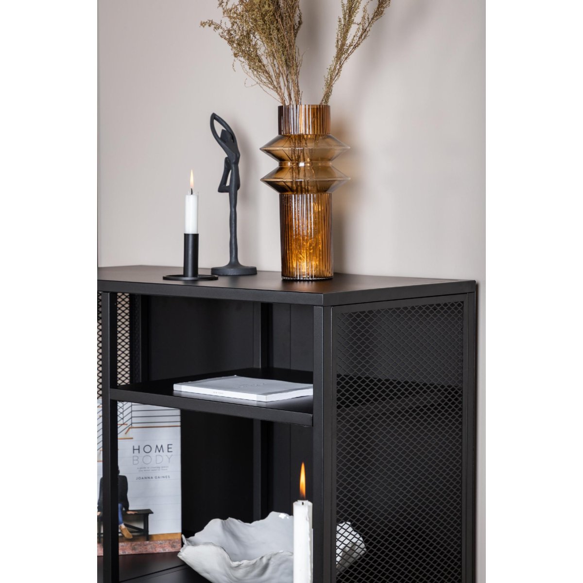 Ontdek de veelzijdigheid van de Henrik Wandkast Mesh – Zwart van QUVIO, een stijlvolle en functionele opbergoplossing voor elk interieur. Deze robuuste kast is vervaardigd uit gepoedercoat zwart staal en biedt een industriële uitstraling die perfect past in moderne woonruimtes. Met drie opbergvlakken op verschillende hoogtes biedt deze kast voldoende ruimte voor boeken, decoraties en meer. De zijpanelen van gaas geven een extra dimensie aan het ontwerp, terwijl de vier stevige stalen poten zorgen voor stabiliteit. Met afmetingen van 80 cm breed, 40 cm diep en 110 cm hoog, past deze kast moeiteloos in elke kamer.