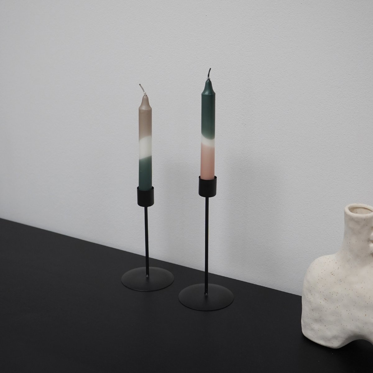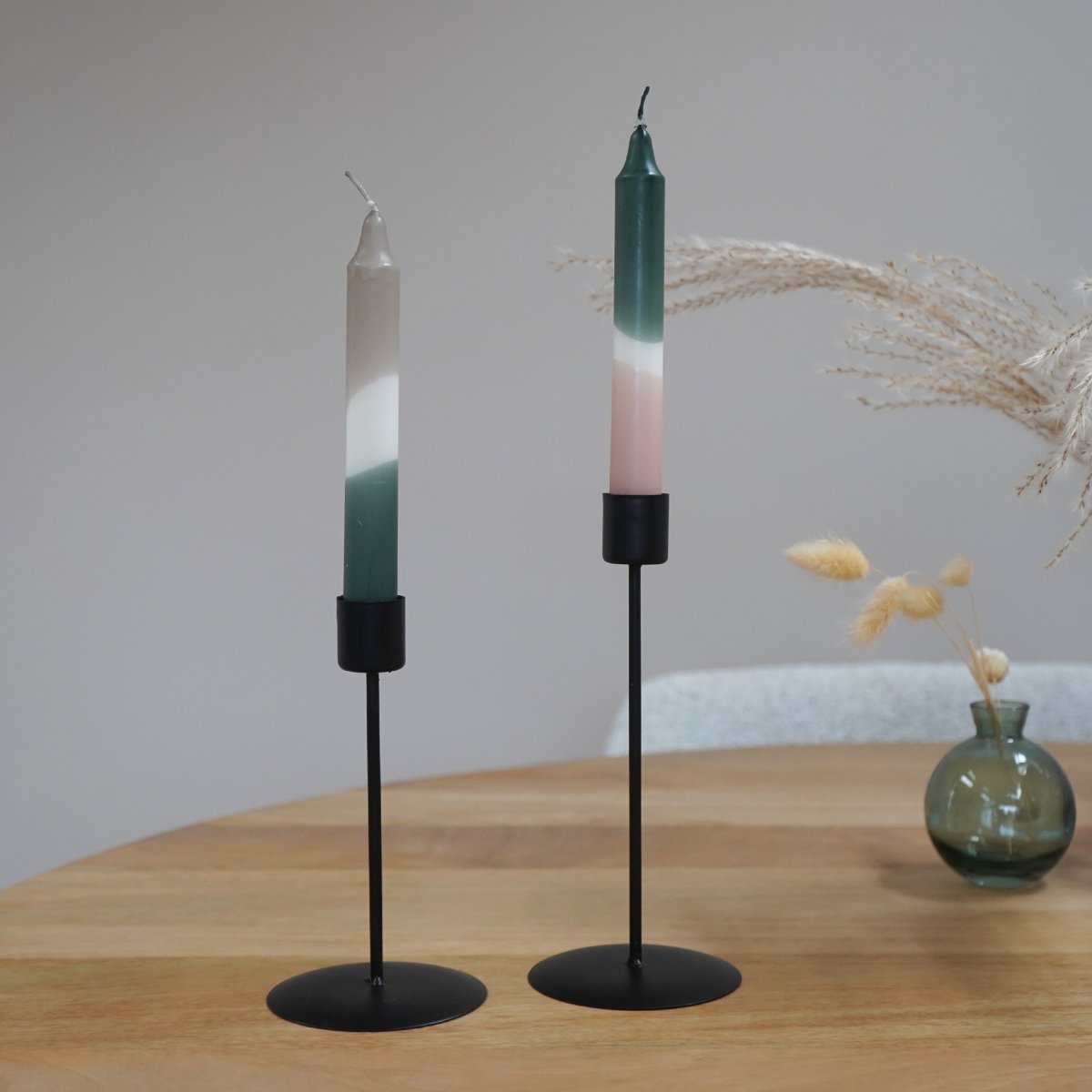 Deze kaarsenhouders zijn geschikt voor smalle, hoge kaarsen. Welke kleur deze kaarsen hebben, kies jij helemaal zelf. Zo kun je het strakke uiterlijk van de kaarsenstandaard benadrukken door te kiezen voor kaarsen in een neutrale kleur, zoals gebroken wit. Maar je kunt ook wat extra pit toevoegen aan het uiterlijk, door juist een felgekleurde kaars in de standaard te zetten. De zwarte kleur van de kaarsenhouder laat zich uitstekend combineren met onder andere rood, paars en geel. Het is maar net wat jij mooi vindt.