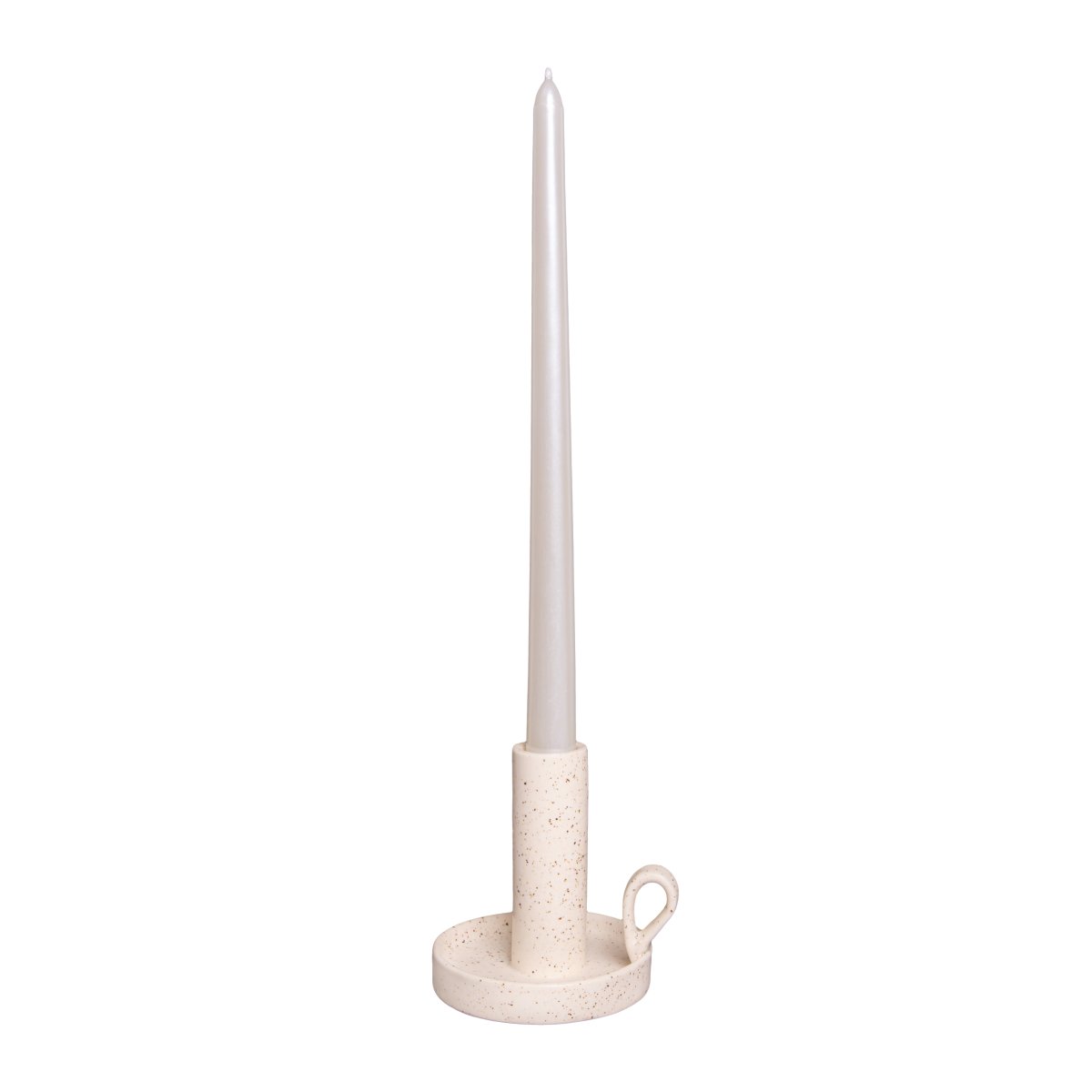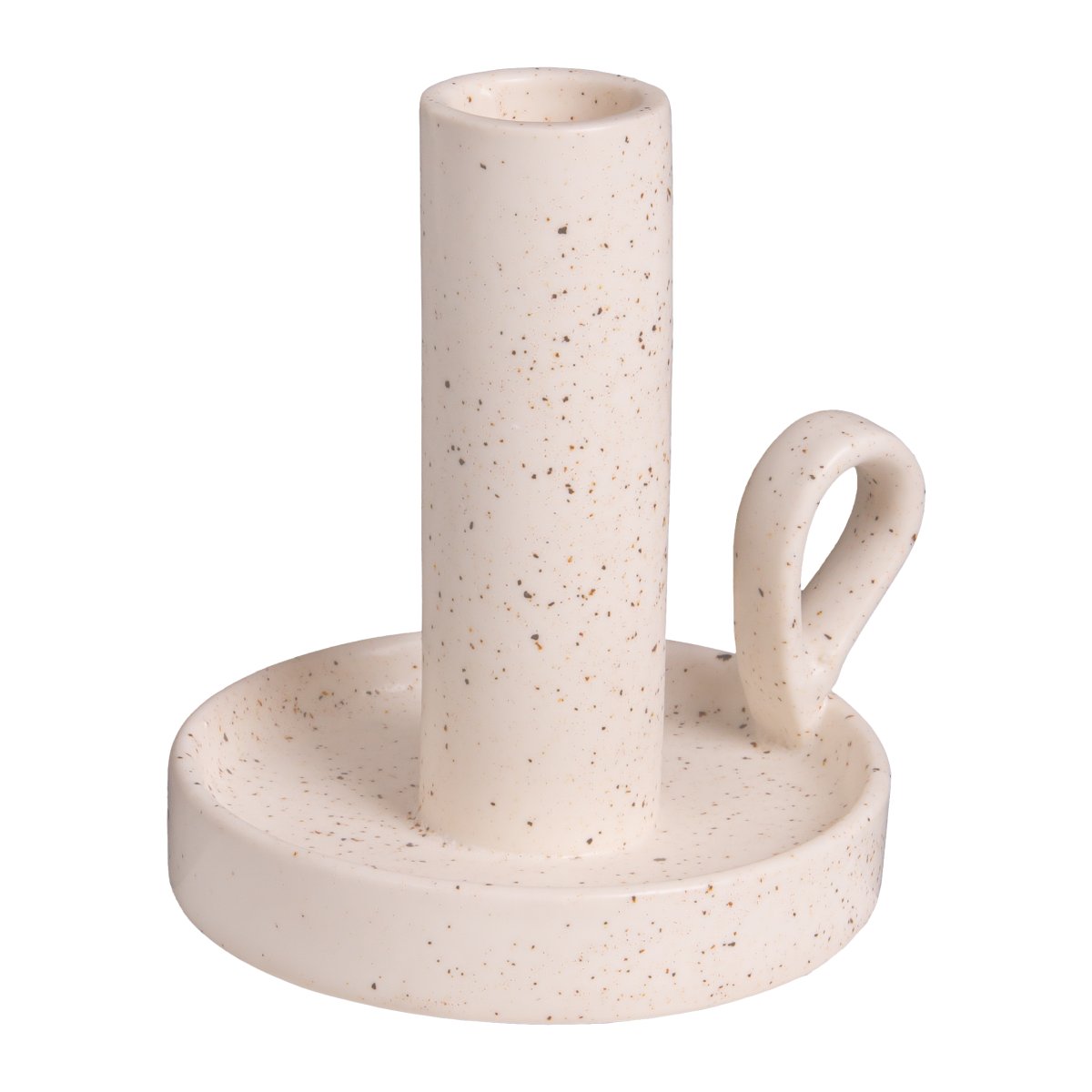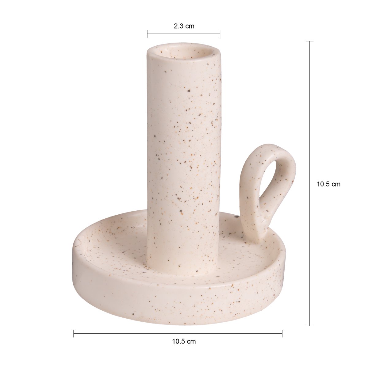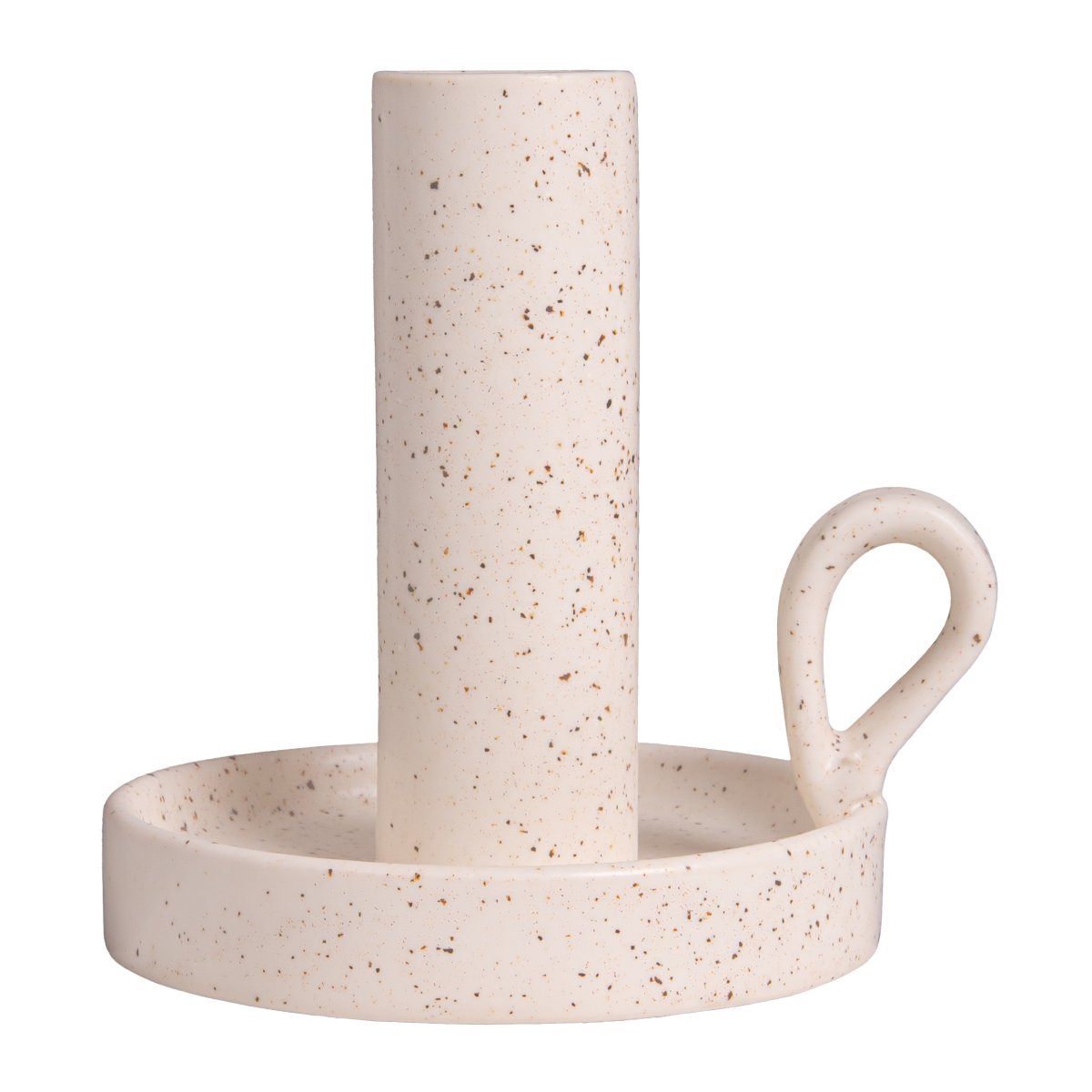 De kaarsenhouder heeft een minimalistische look met zijn gebroken witte kleur en charmante spikkels. De speelse spikkels geven een speelse draai aan het gladde keramiek. Zowel het schaaltje als het oortje geven de kandelaar niet alleen een mooi model, maar zijn ook nog eens handig. Met het oortje verplaats je de kandelaar gemakkelijk, en het schaaltje vangt de druppels kaarsvet op.