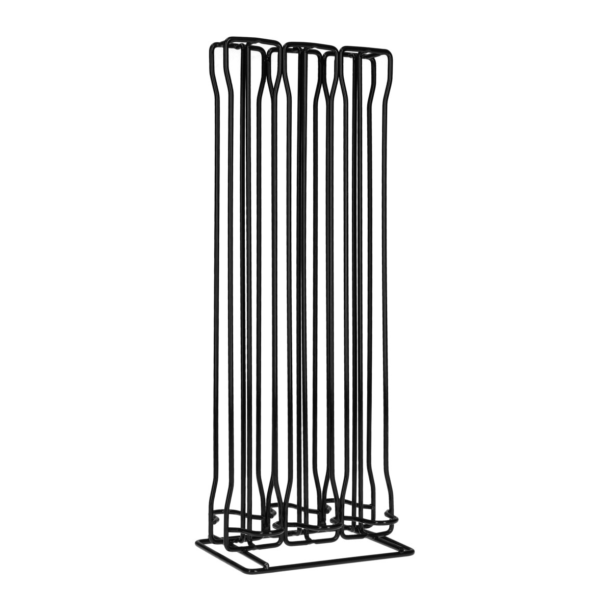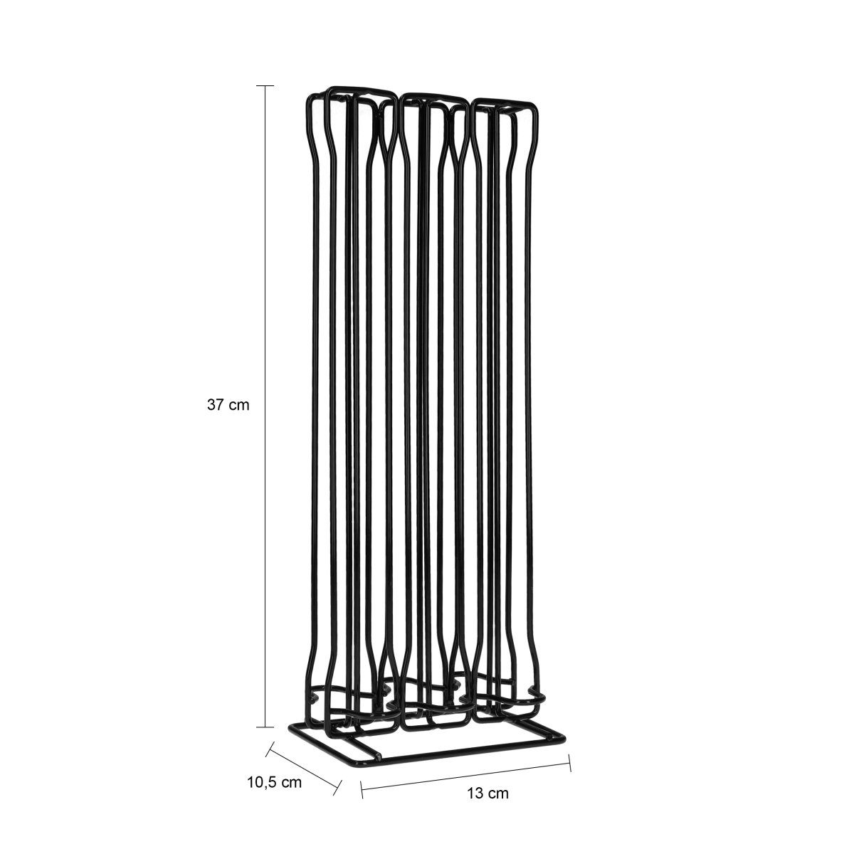 De koffiecup houder voor zestig capsules is gemaakt van zwart metaal. In totaal heeft de koffiecupstandaard zes rails waar Nespresso cups makkelijk in geschoven kunnen worden. Het ontwerp is simpel en praktisch.