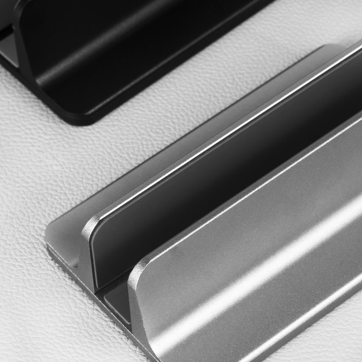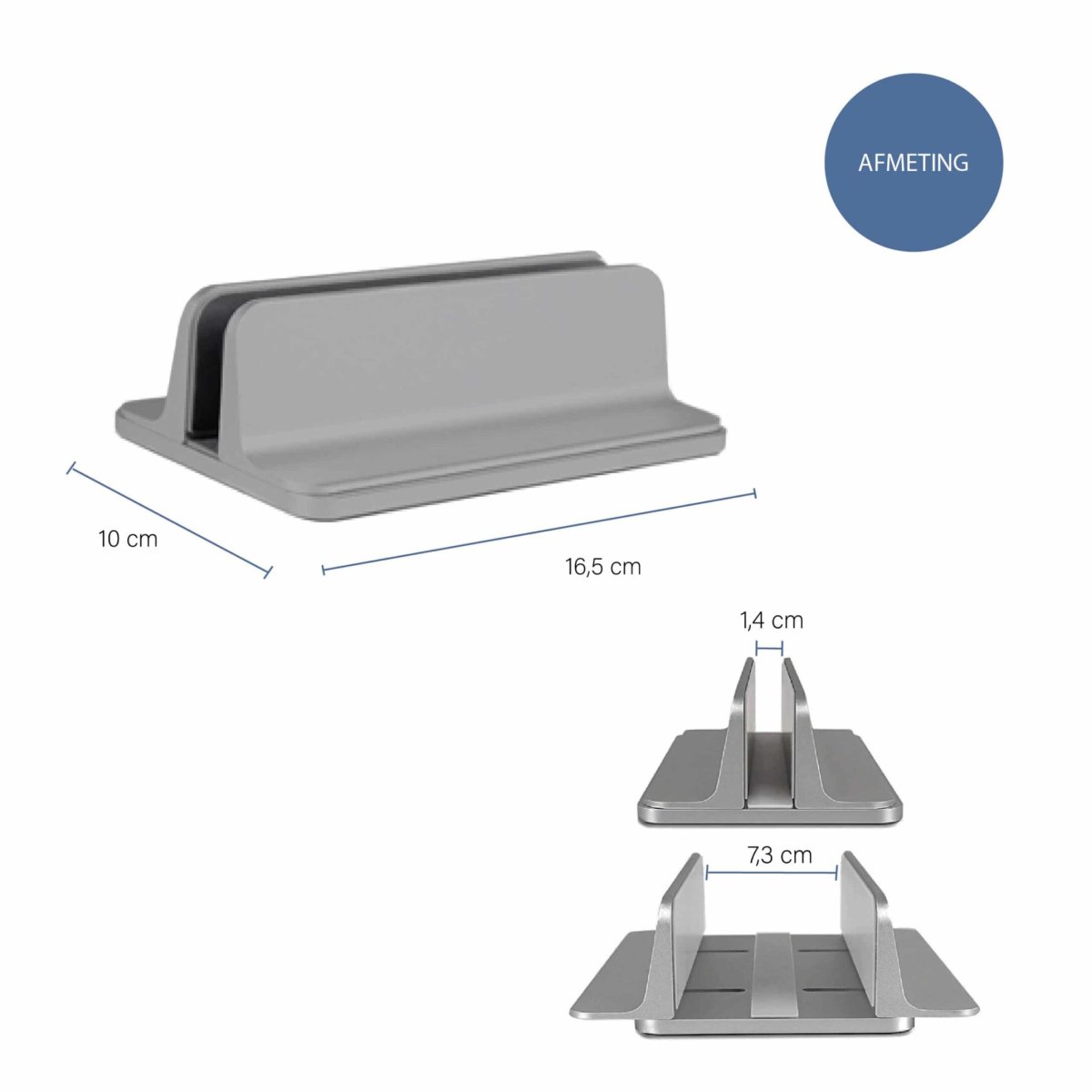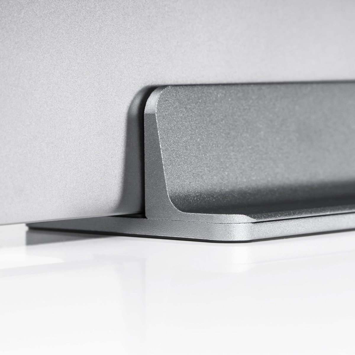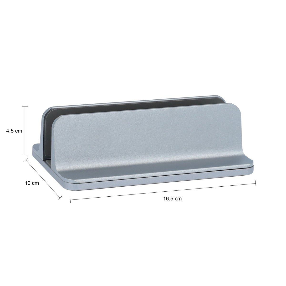 Ook een boek past in deze grijze verticale laptopstandaard