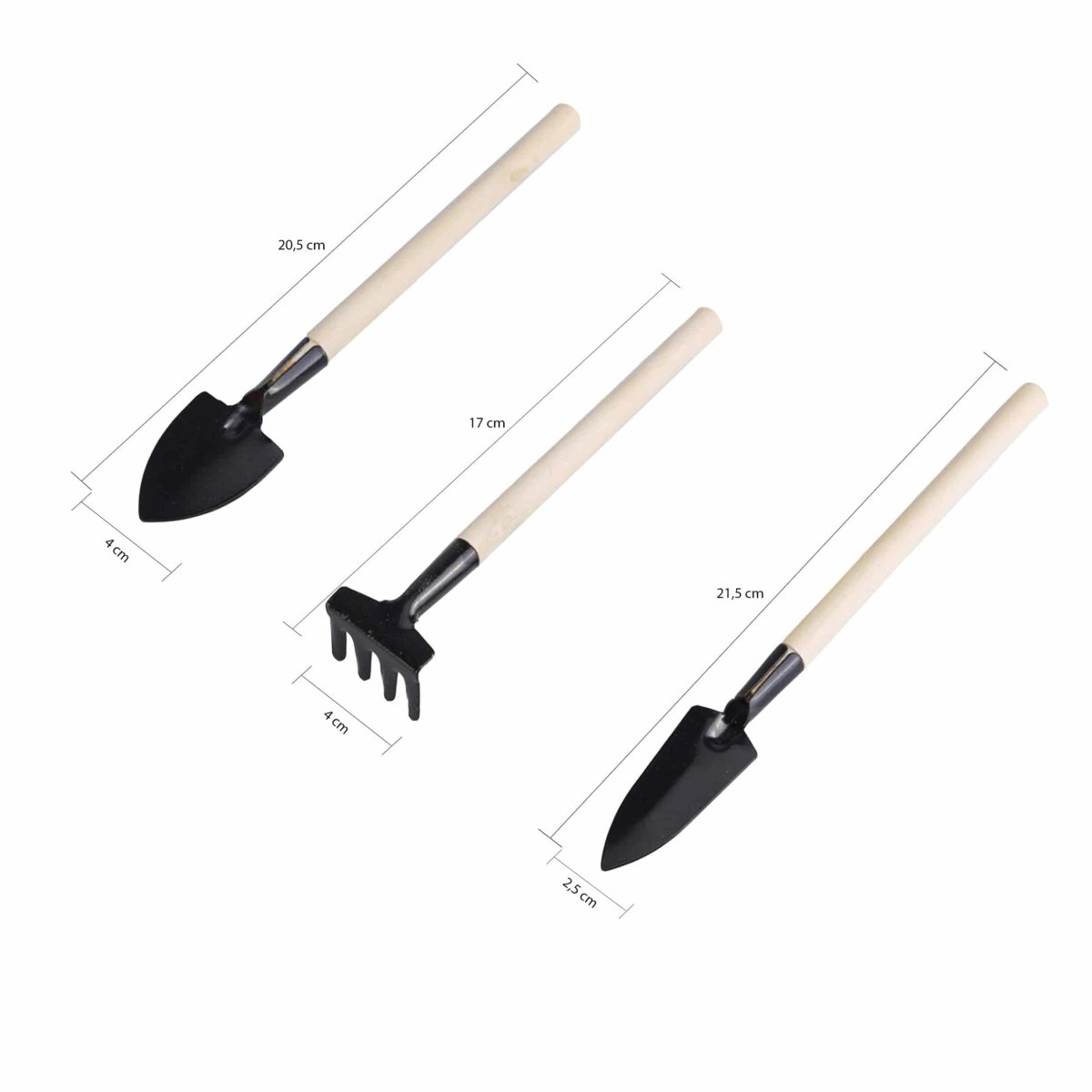 De maten van de QUVIO producten in het mini tuingereedschappen setje schelen niet veel van elkaar, maar hebben wel ietwat andere lengtes. Het stuk mini tuingereedschap met de smalle schep heeft een lengte 21,5 centimeter en heeft een totale breedte van 2,5 centimeter. Het product dat een wat breder schep deel heeft, heeft in totaal een lengte van 20,5 centimeter en een breedte van 4 centimeter. Het product dat bedoeld is om mee te harken heeft een lengte van 17 centimeter en een breedte van 4 centimeter. Deze set mini tuingereedschap brengt de voordelen met zich mee dat het voor talloze klusjes gebruikt kan worden en niet voor enkel 1 taak bedoeld is. In ieder appartement met plantenbakken kan het setje zelfs handig uitkomen bij de onderhoud.