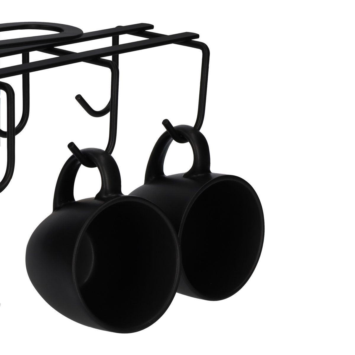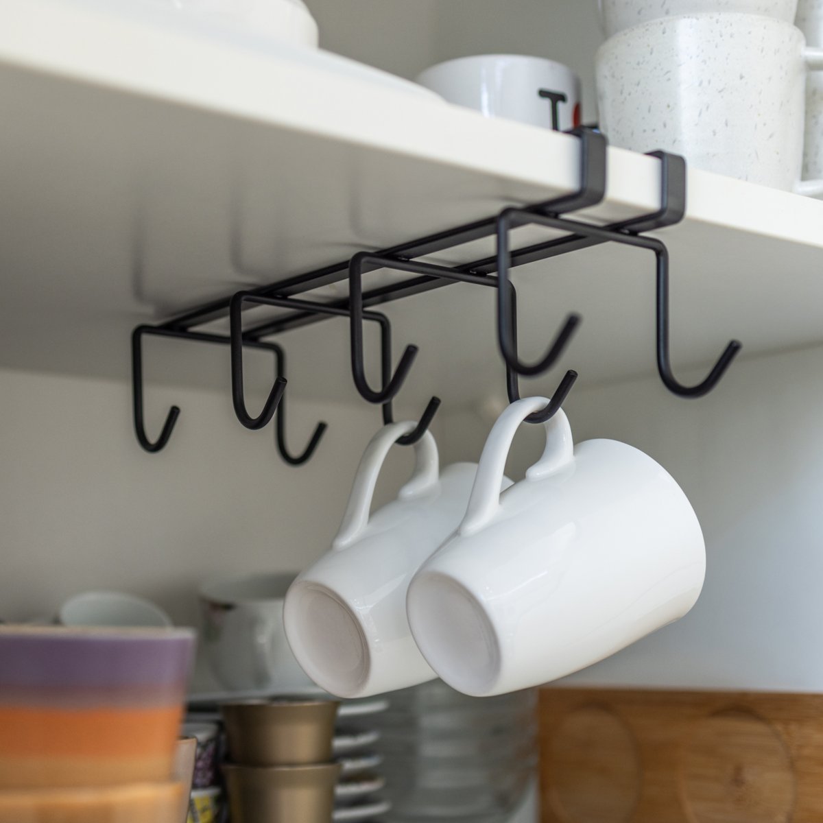 Dit kopjesrek van QUVIO heeft acht haken om kopjes aan te hangen. Wil je graag meer mokken kwijt? Dan hang je meerdere van deze mokken houders naast elkaar. Zo creëer je je eigen mokken-muur in de keuken. Door kopjes in bijpassende kleuren op te hangen, worden de bekers onderdeel van je keuken interieur. Bovendien hangt jouw favoriete mok zo altijd voor het grijpen. Weet jij al waar je dit zwarte mokken houder van metaal een plekje gaat geven?