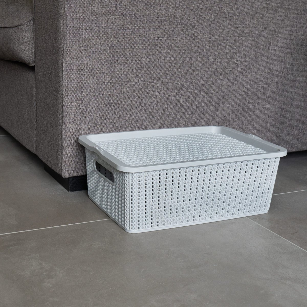 Een opgeruimd huis dankzij deze grijze opbergmand met deksel